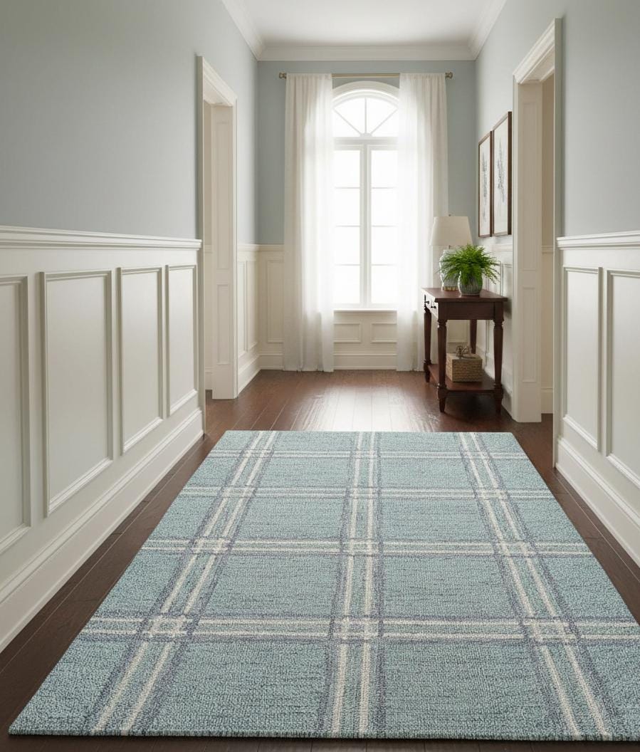 Handwoven Wool Plaid Area Rug, Light Blue Grey Checkered Carpet