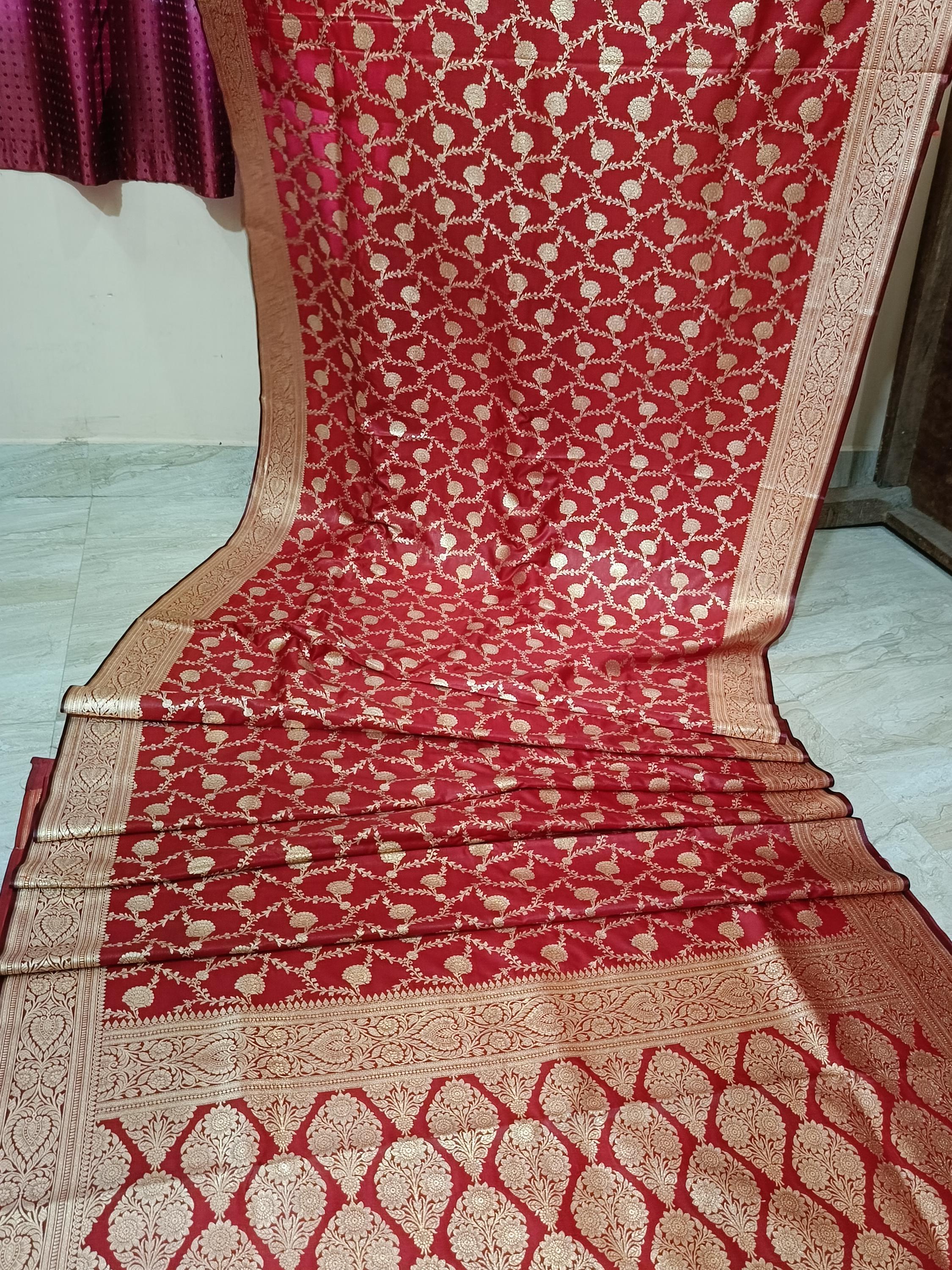 Bright red banarsi satin silk traditional saree with zari
