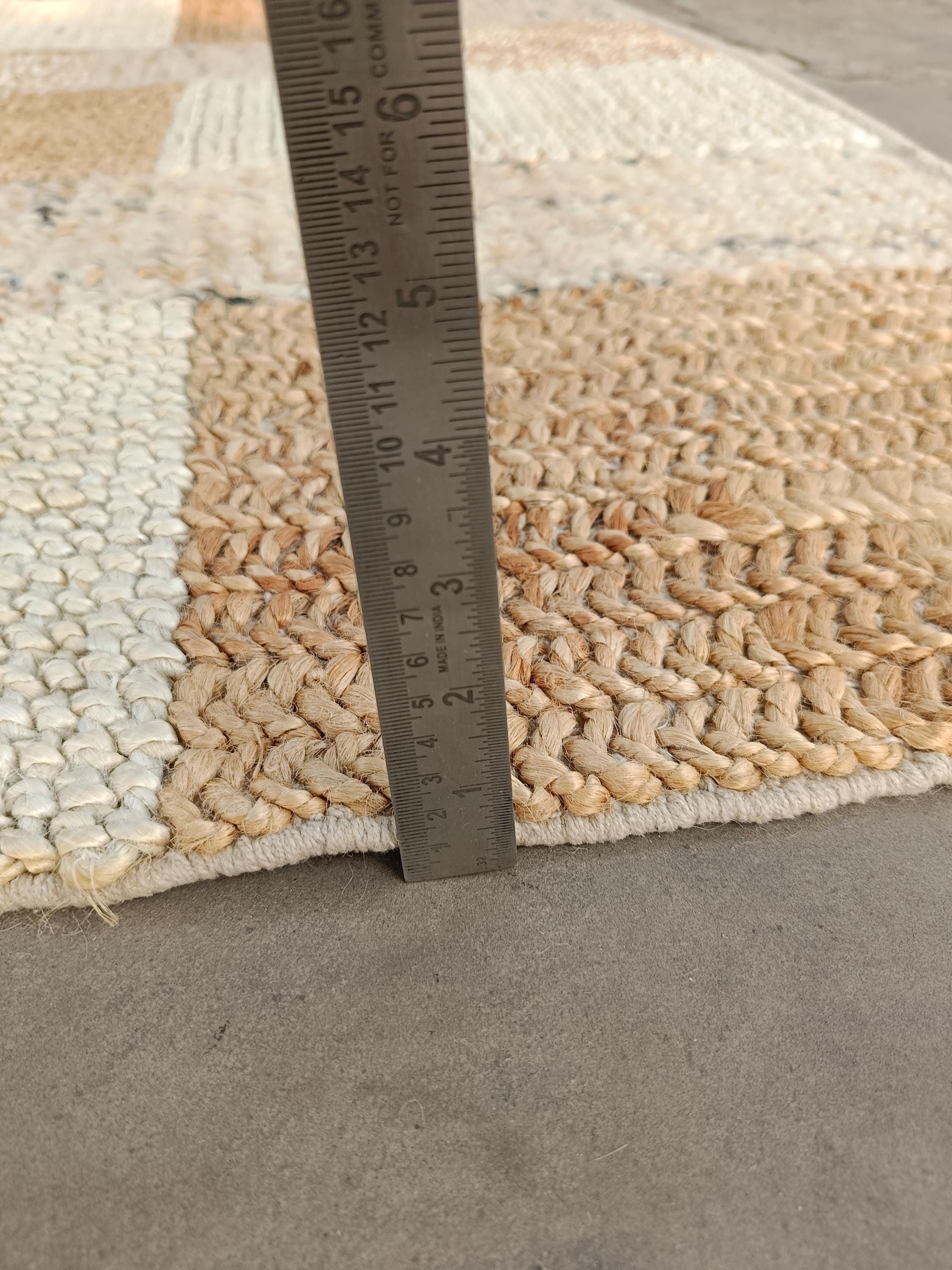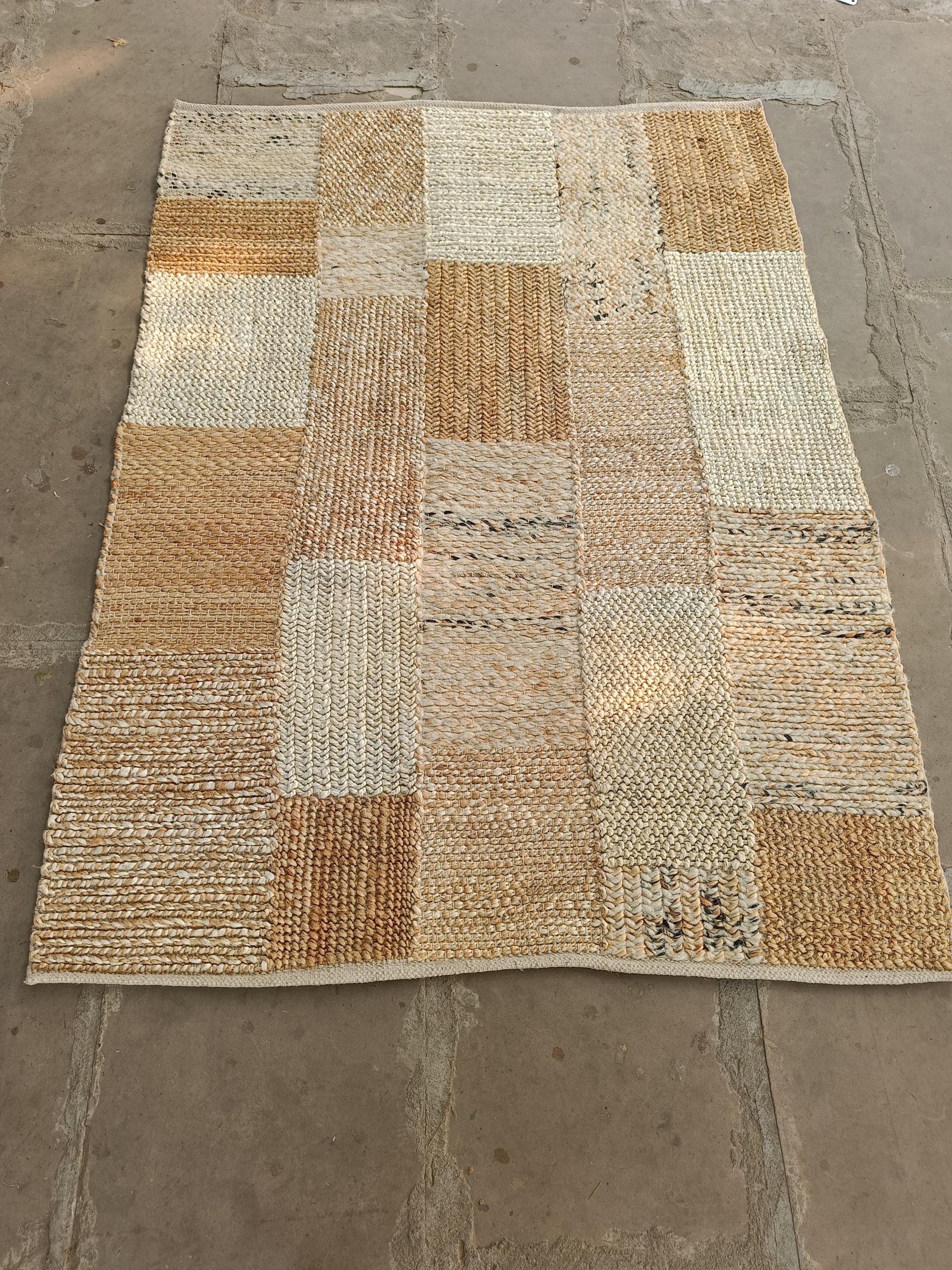 Elevate your space with this handwoven natural jute rug, designed in a beautiful patchwork layout of varied textures and neutral tones. Each section showcases a unique weave, creating rich visual depth while maintaining an organic, earthy feel.