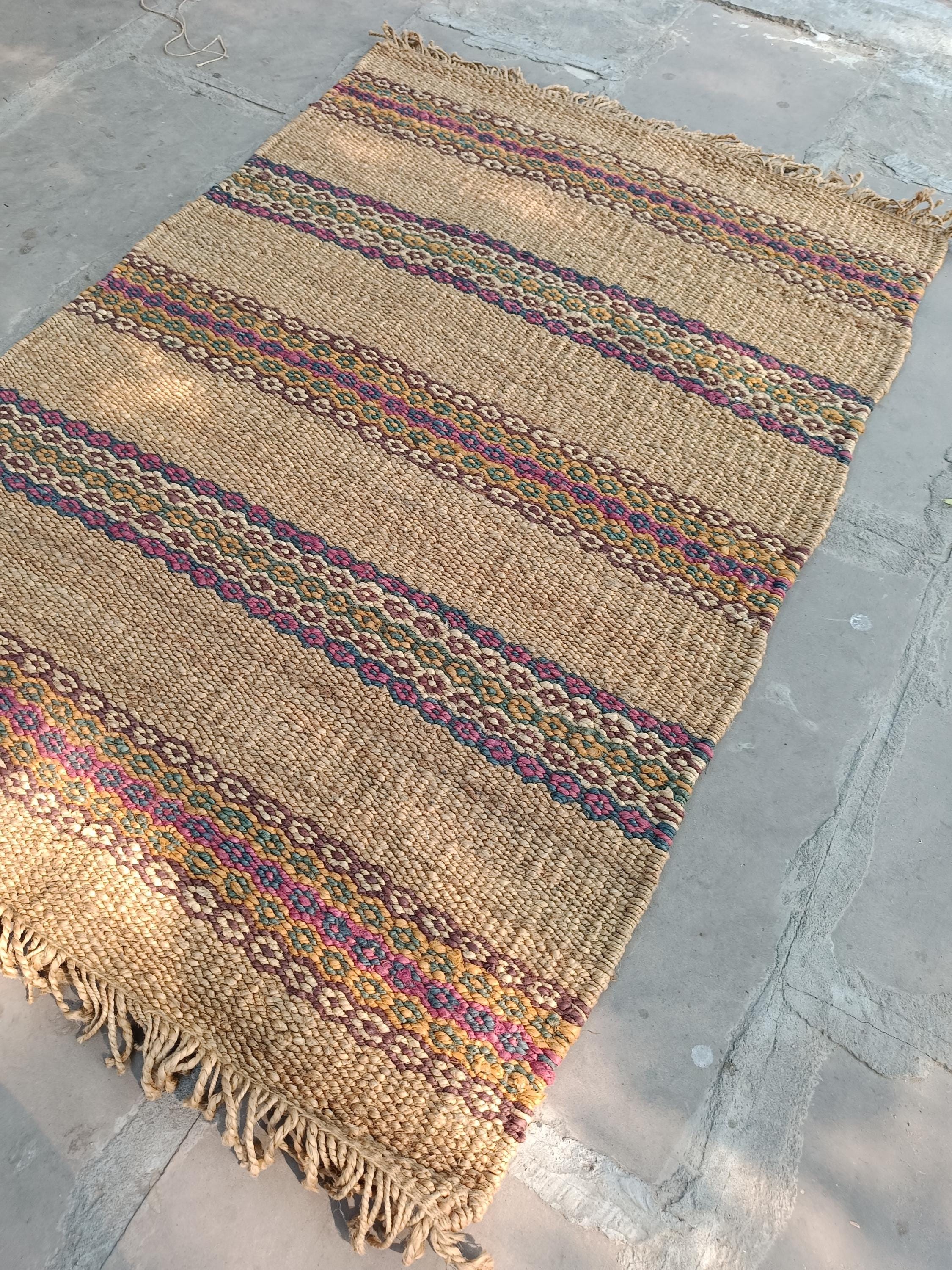 Brighten your space naturally with this handwoven jute rug, featuring colorful woven stripe accents and charming fringed edges. Made from 100% natural jute fiber, this rug blends earthy texture with subtle pops of color—perfect for boho, farmhouse, eclectic, and rustic interiors.