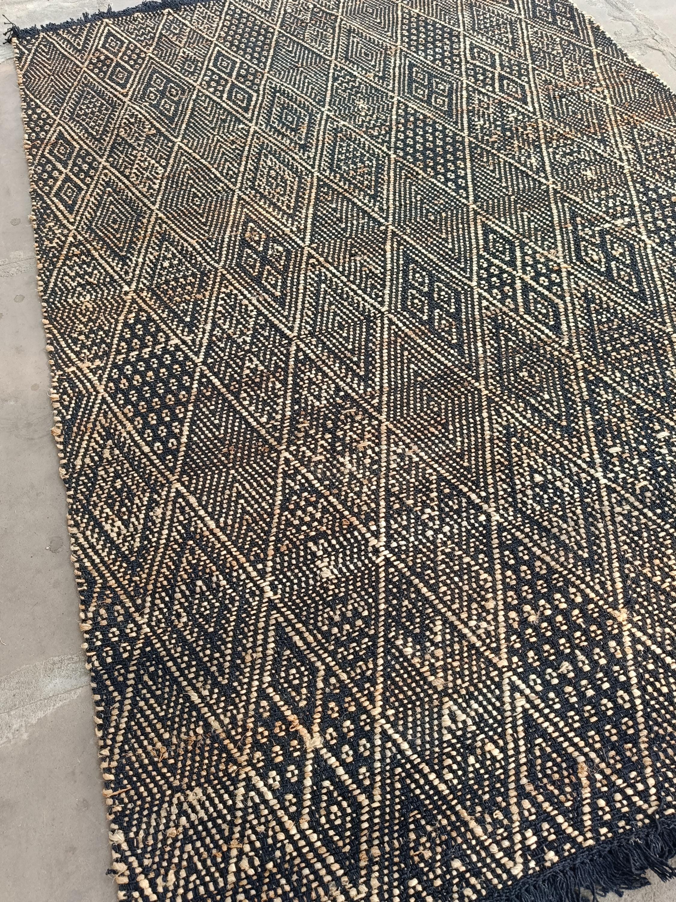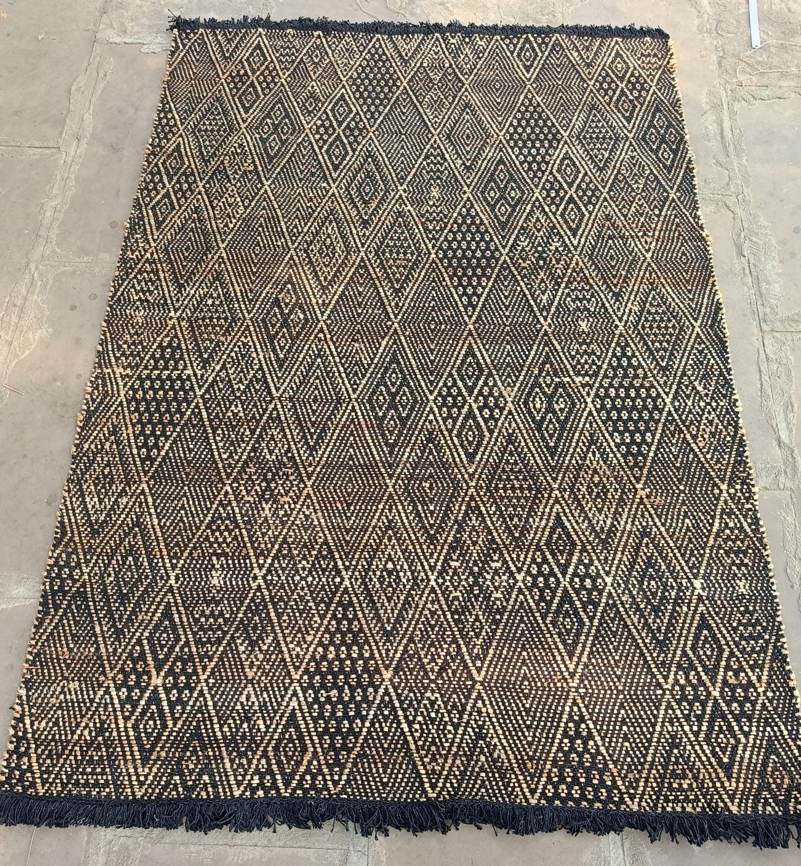 Add bold character and earthy texture to your space with this handcrafted flatweave rug, featuring a striking diamond geometric pattern in black and natural tones. Designed to suit modern, boho, tribal, and minimalist interiors, this rug is both stylish and durable.