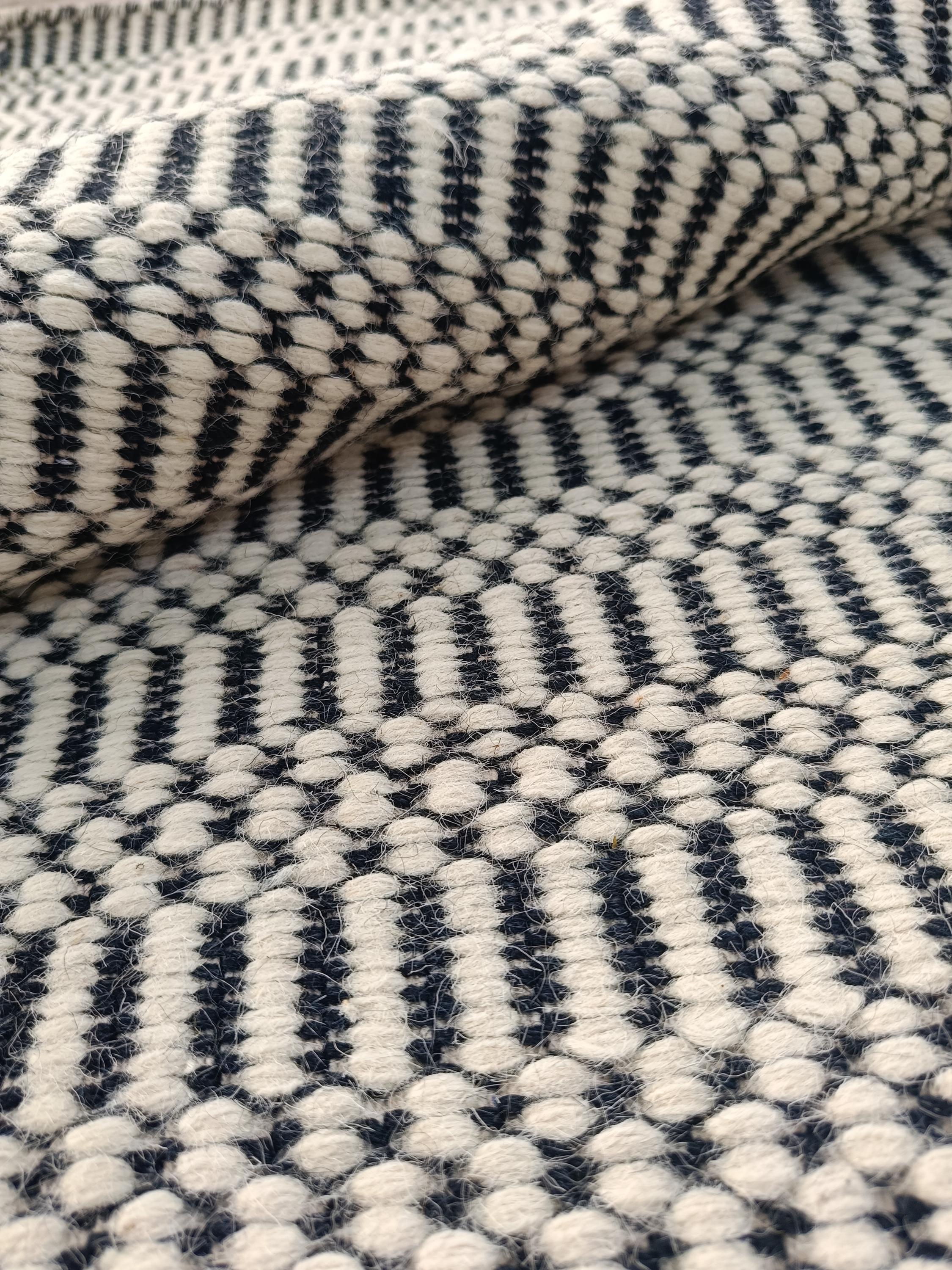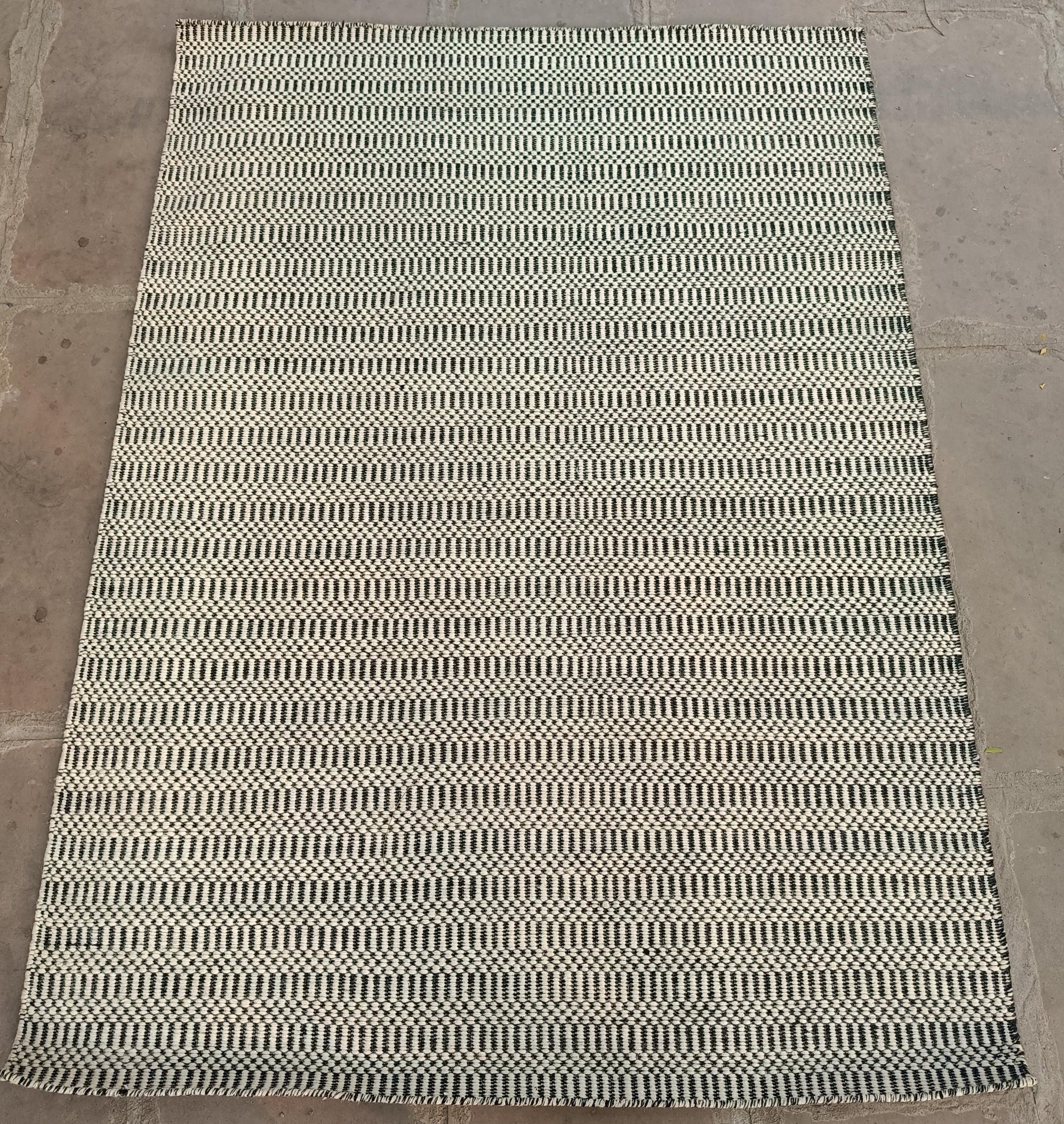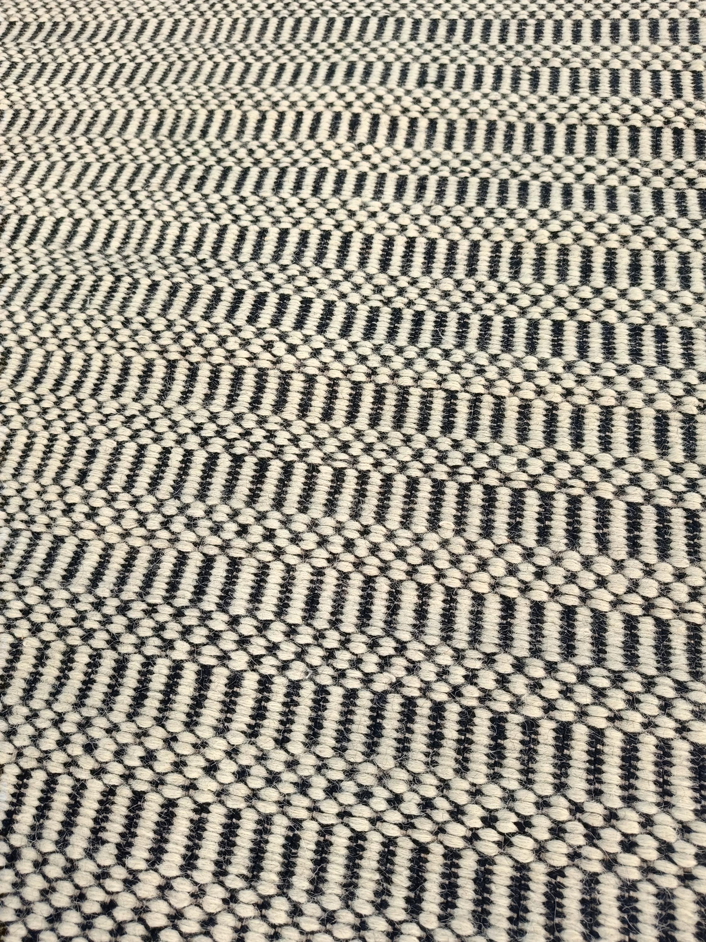 This elegant handmade flatweave rug is woven using high-quality cotton fibers, showcasing a timeless black and ivory stripe pattern. Its neutral tones and textured weave make it a versatile piece that blends effortlessly into both contemporary and traditional spaces.