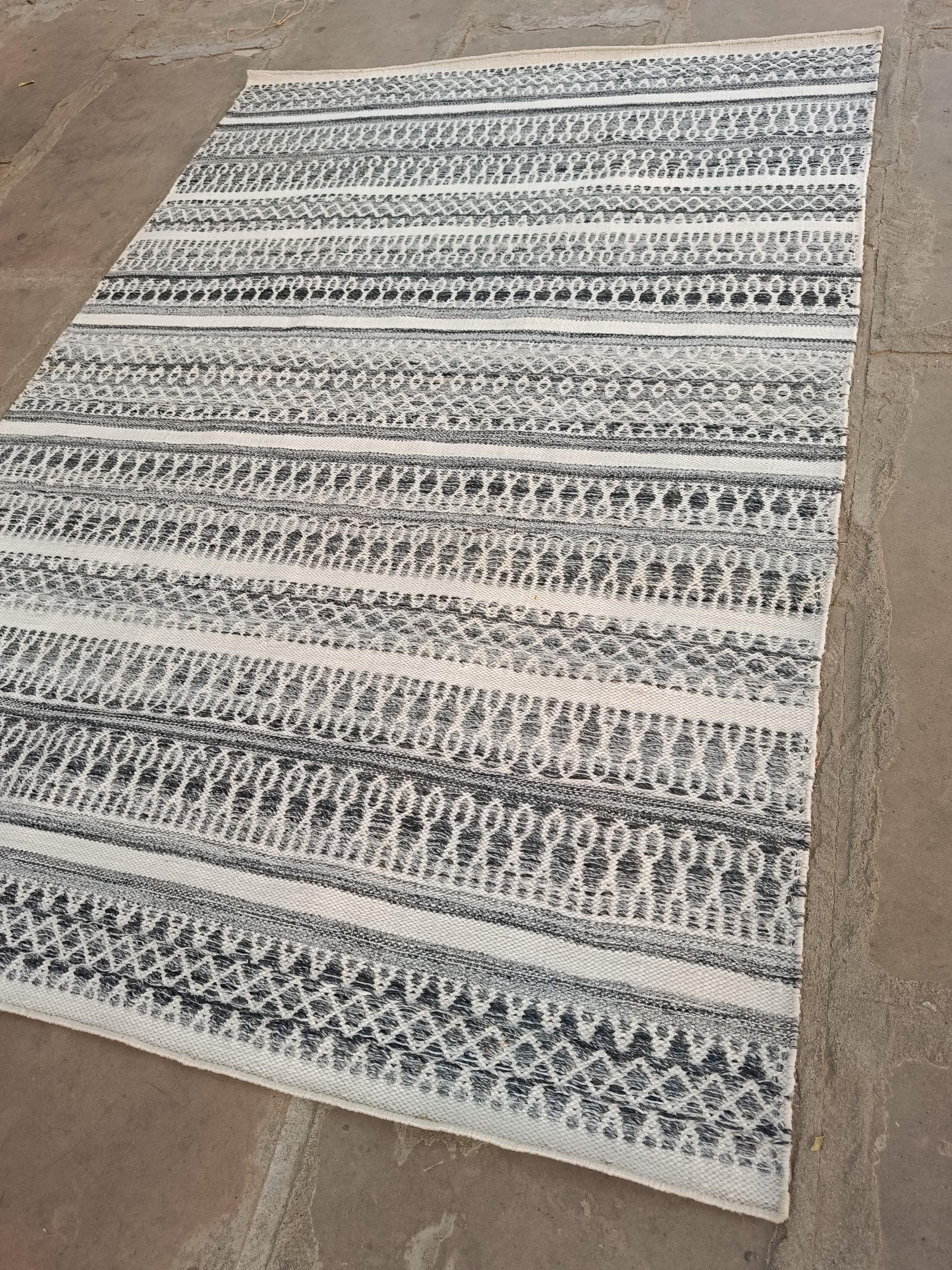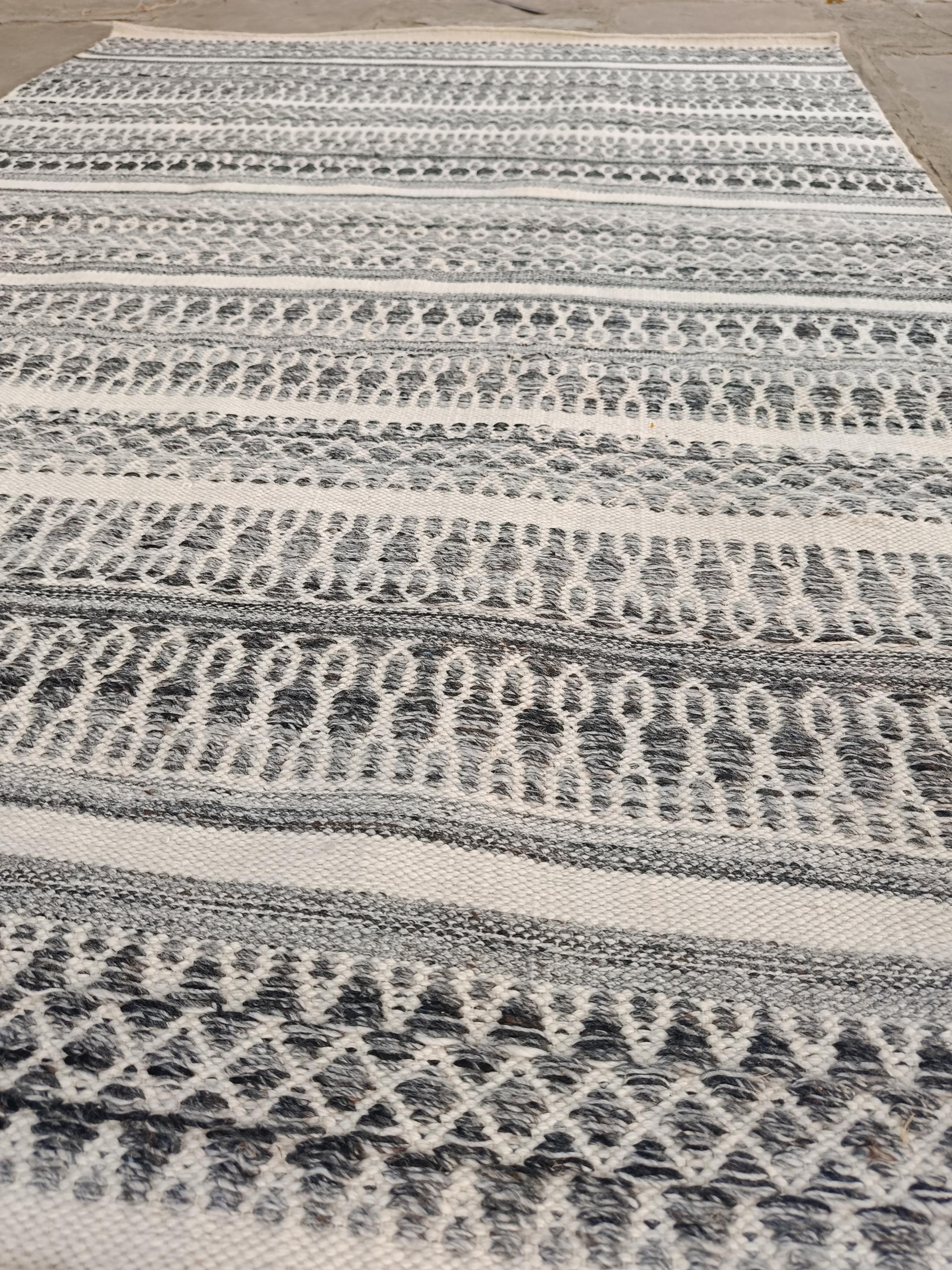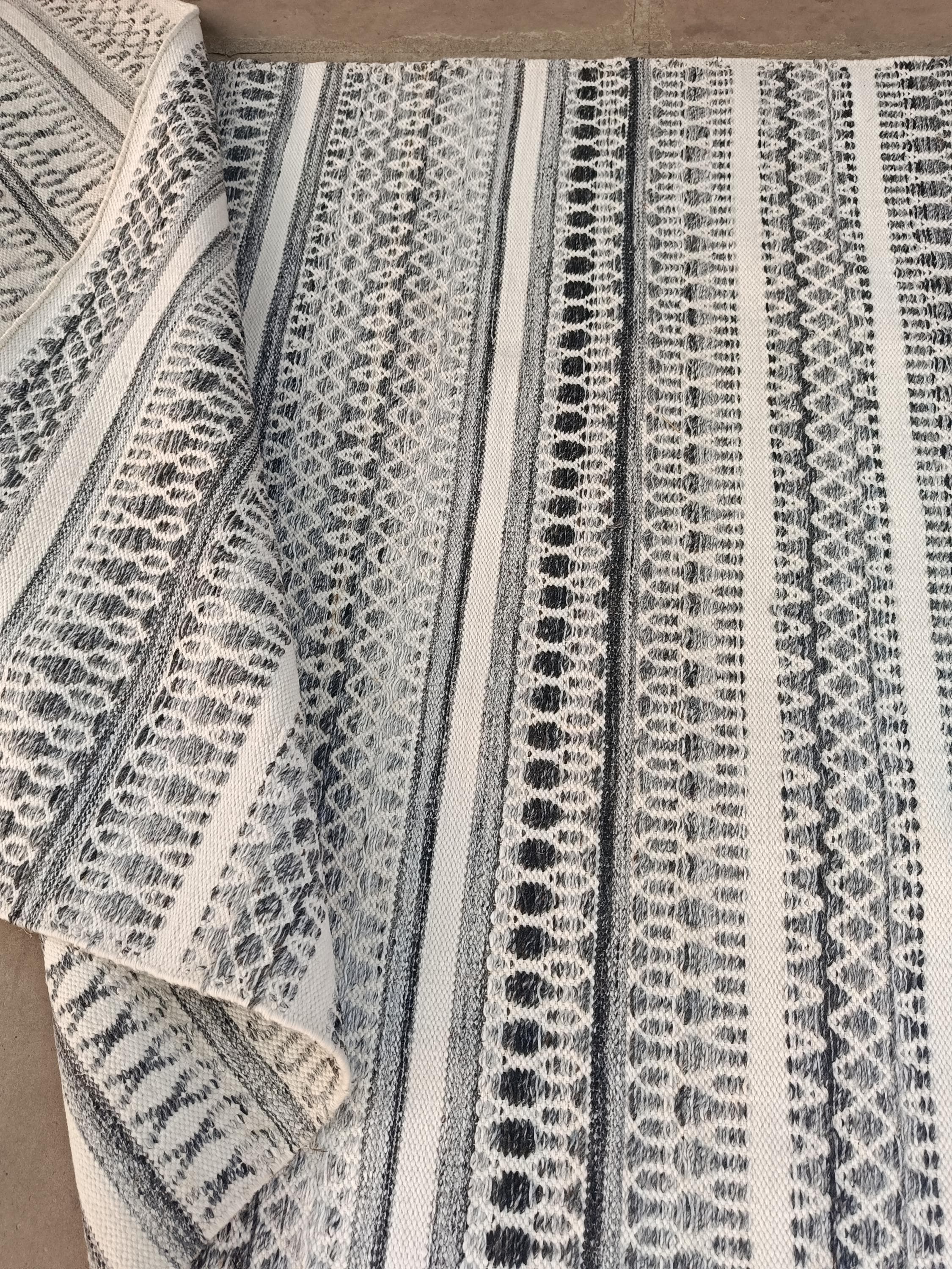 Add modern charm to your space with this handwoven black and white flatweave rug, featuring elegant striped and geometric patterns—perfect for boho, Scandinavian, and modern rug.