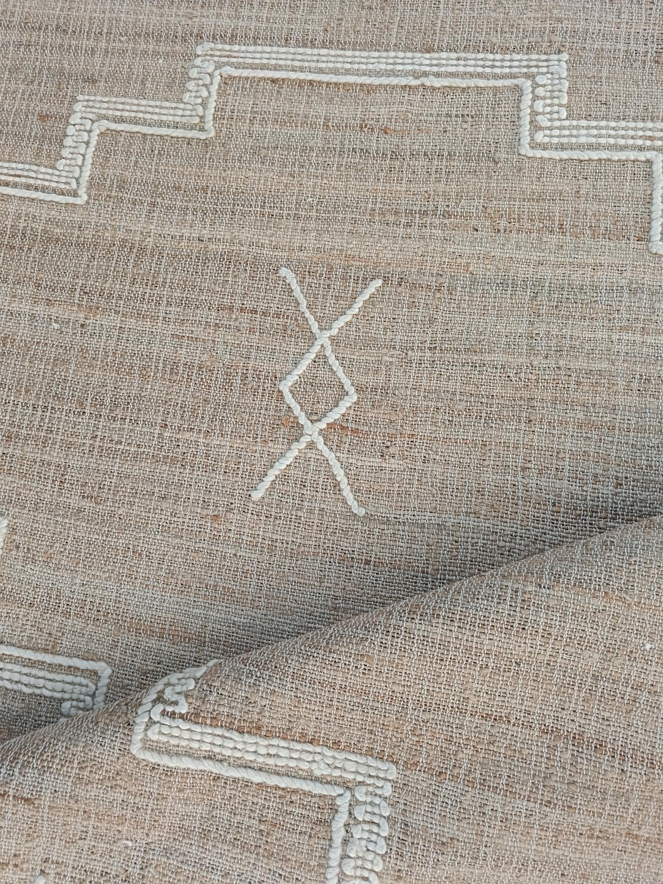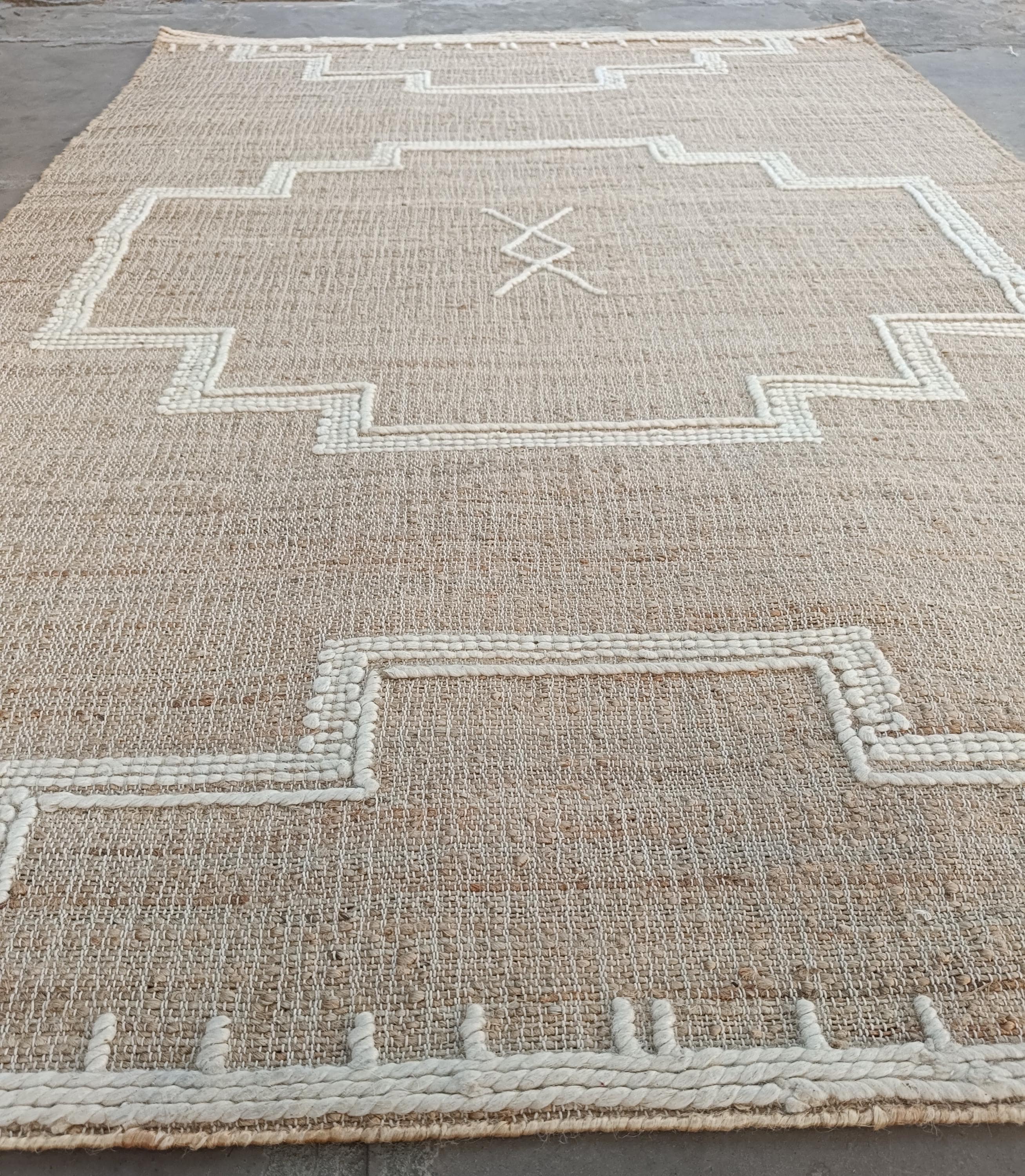 Add warmth and understated elegance to your home with this handwoven flatweave rug, crafted in soothing natural beige tones and accented with raised ivory tribal embroidery. The clean geometric border and subtle central motif give this rug a modern boho feel while keeping the look minimal and timeless.