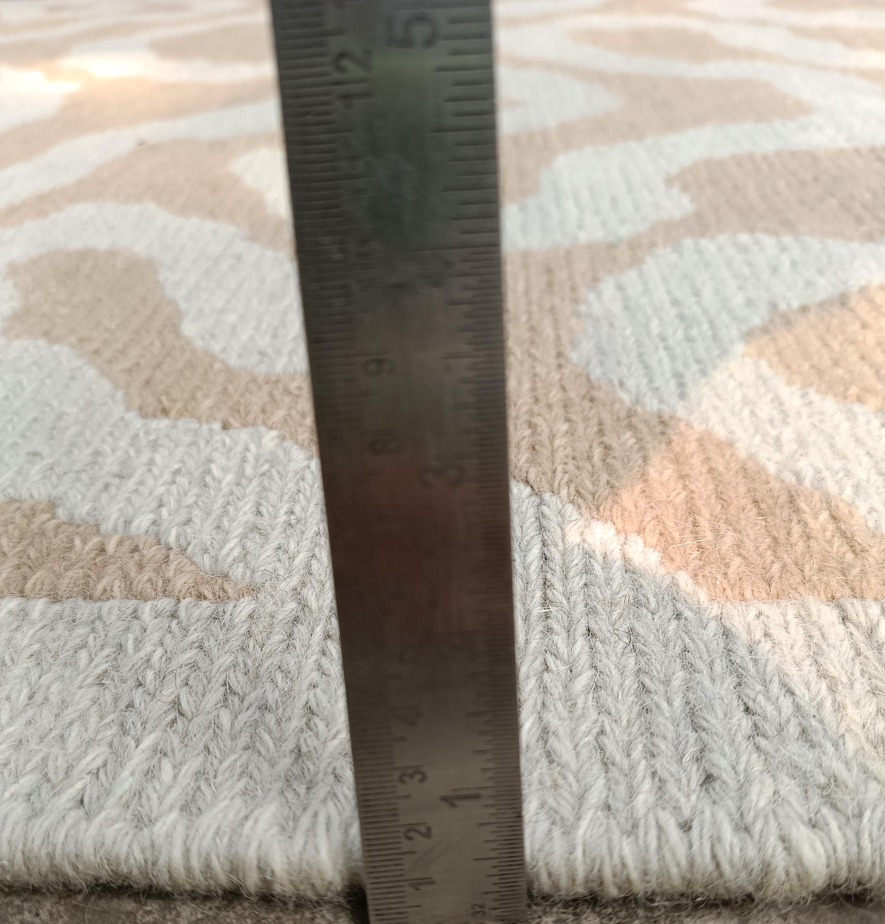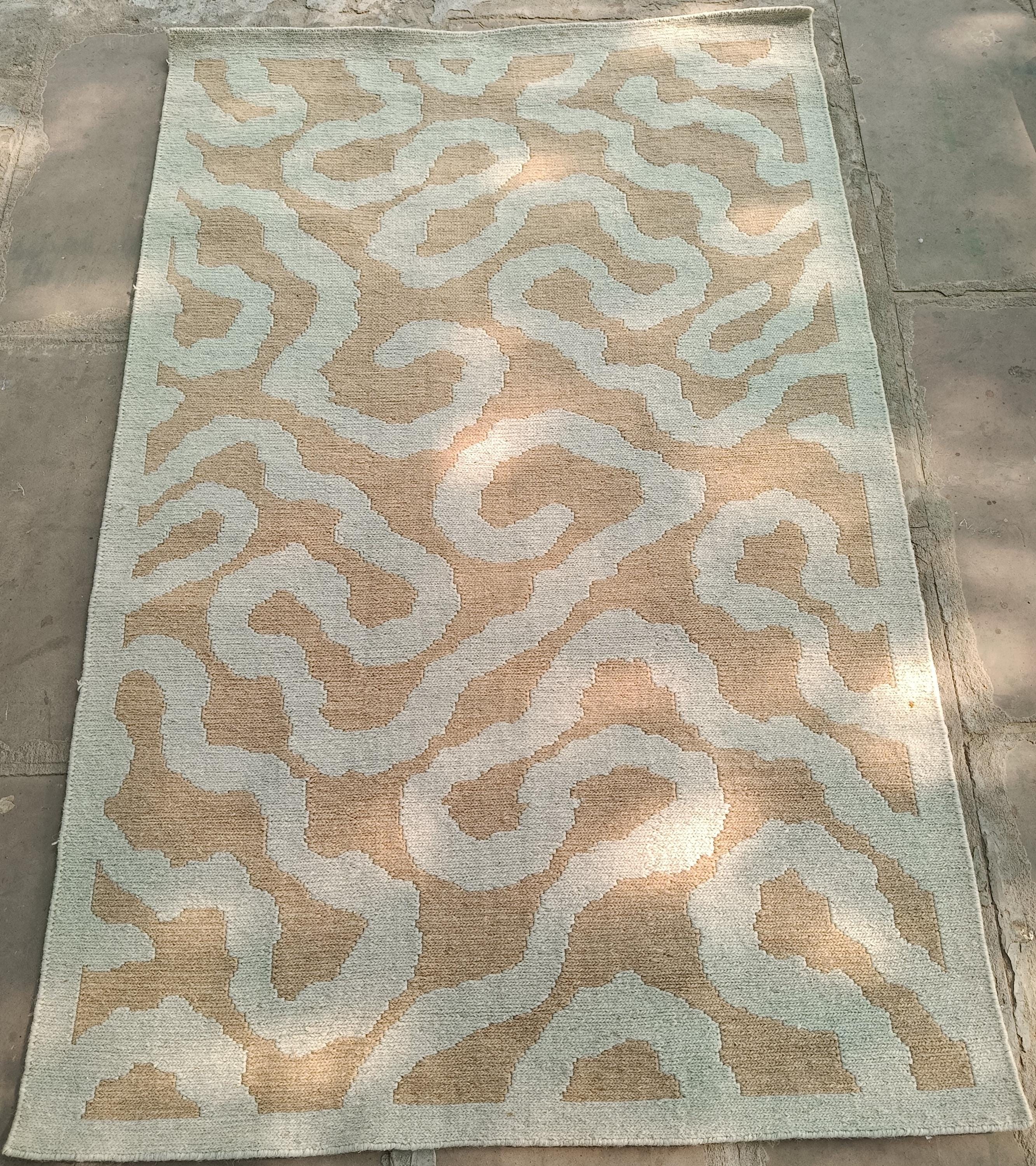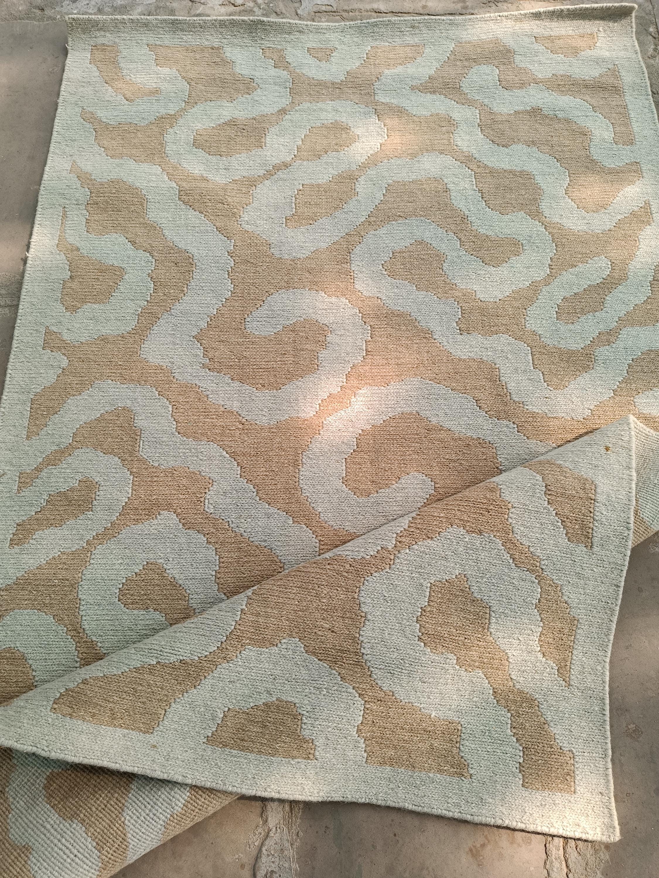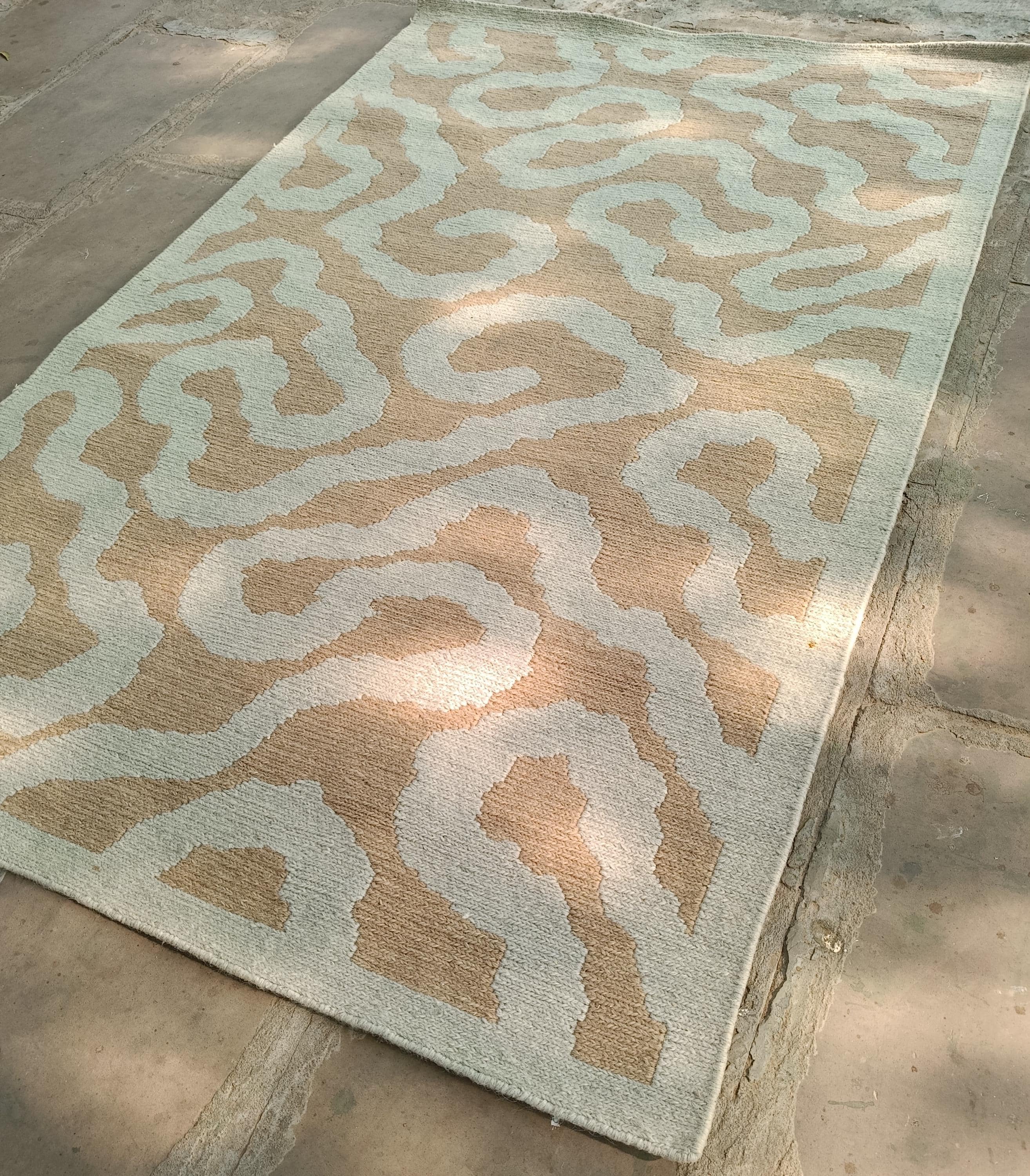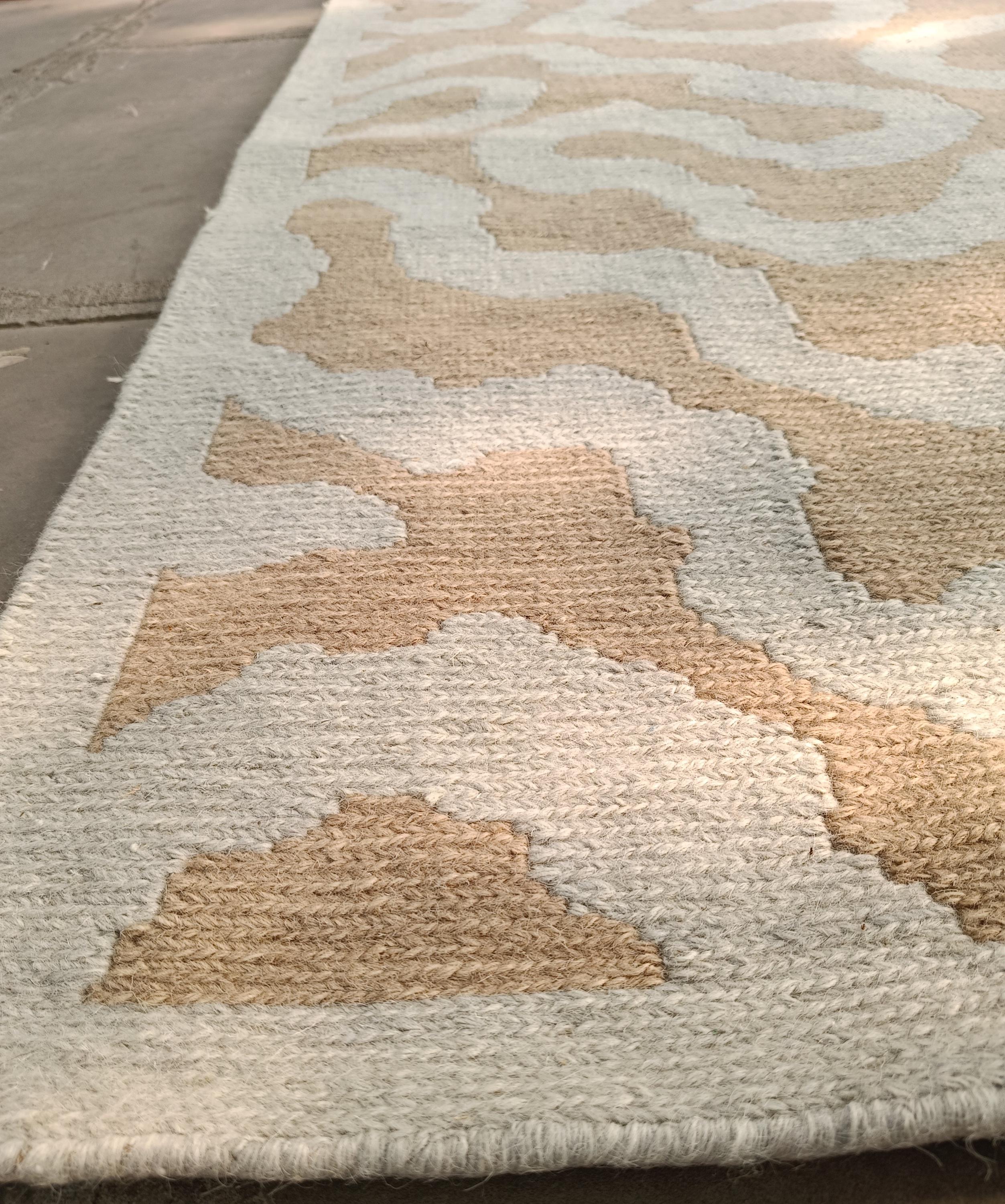 This handwoven abstract wool rug features flowing, organic shapes in calming shades of beige and ivory, creating a soft, modern statement that feels both artistic and timeless. The subtle contrast and pattern add visual interest while keeping a serene, neutral palette.