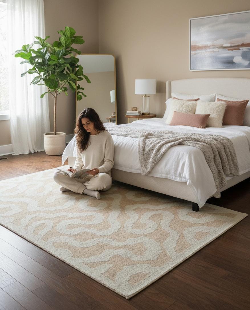 Handwoven Abstract Wool Rug – Modern Organic Pattern Area Rug in Beige & Ivory, Minimalist Home Decor
