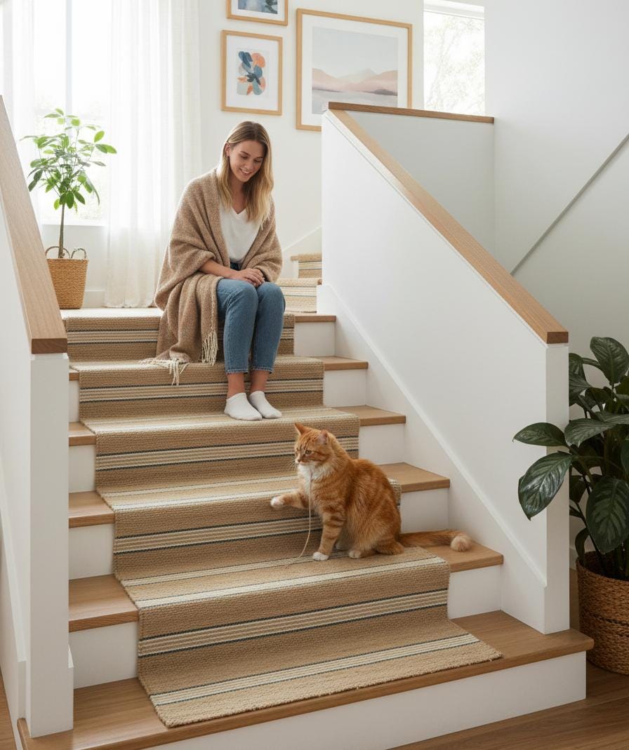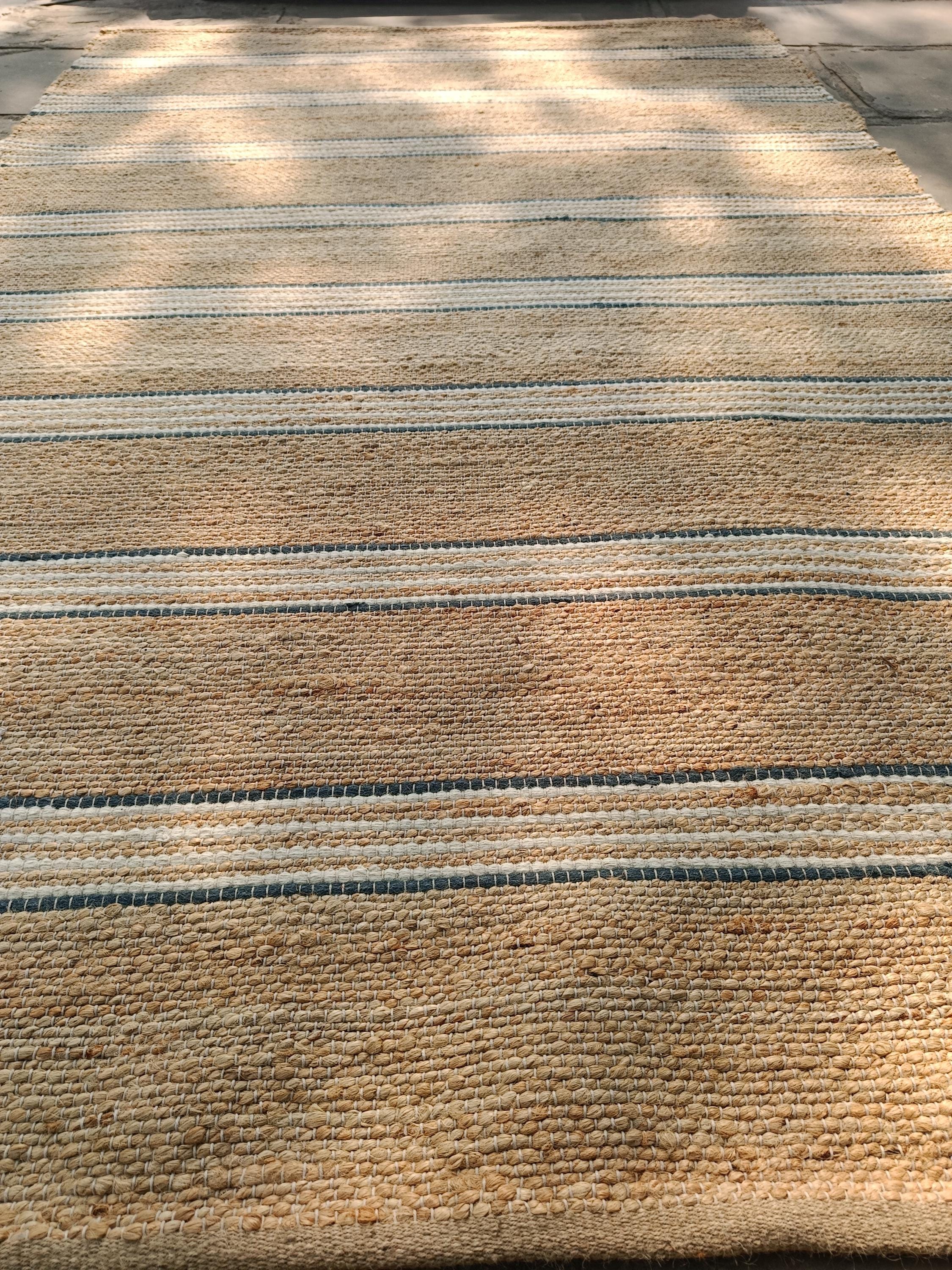 This handwoven striped wool rug blends warm neutral tones with soft blue accents for a clean, relaxed look. The understated stripe pattern adds visual interest while maintaining a minimalist, timeless feel—perfect for modern, Scandinavian, coastal, and boho interiors.