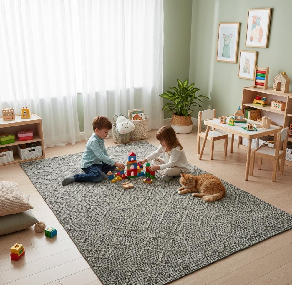 Each rug is unique, with gentle variations in texture and tone that highlight its handcrafted character and natural materials.
