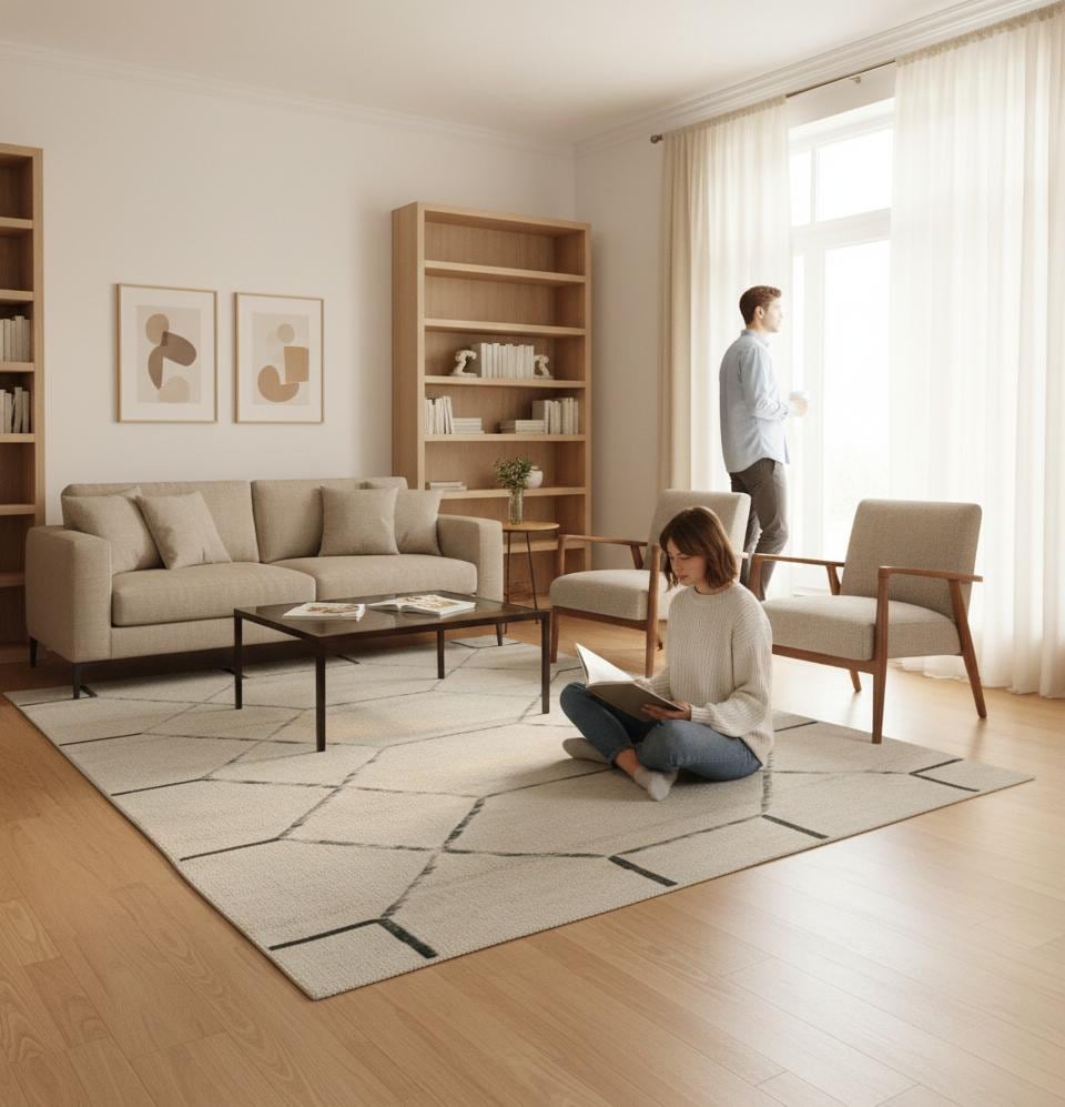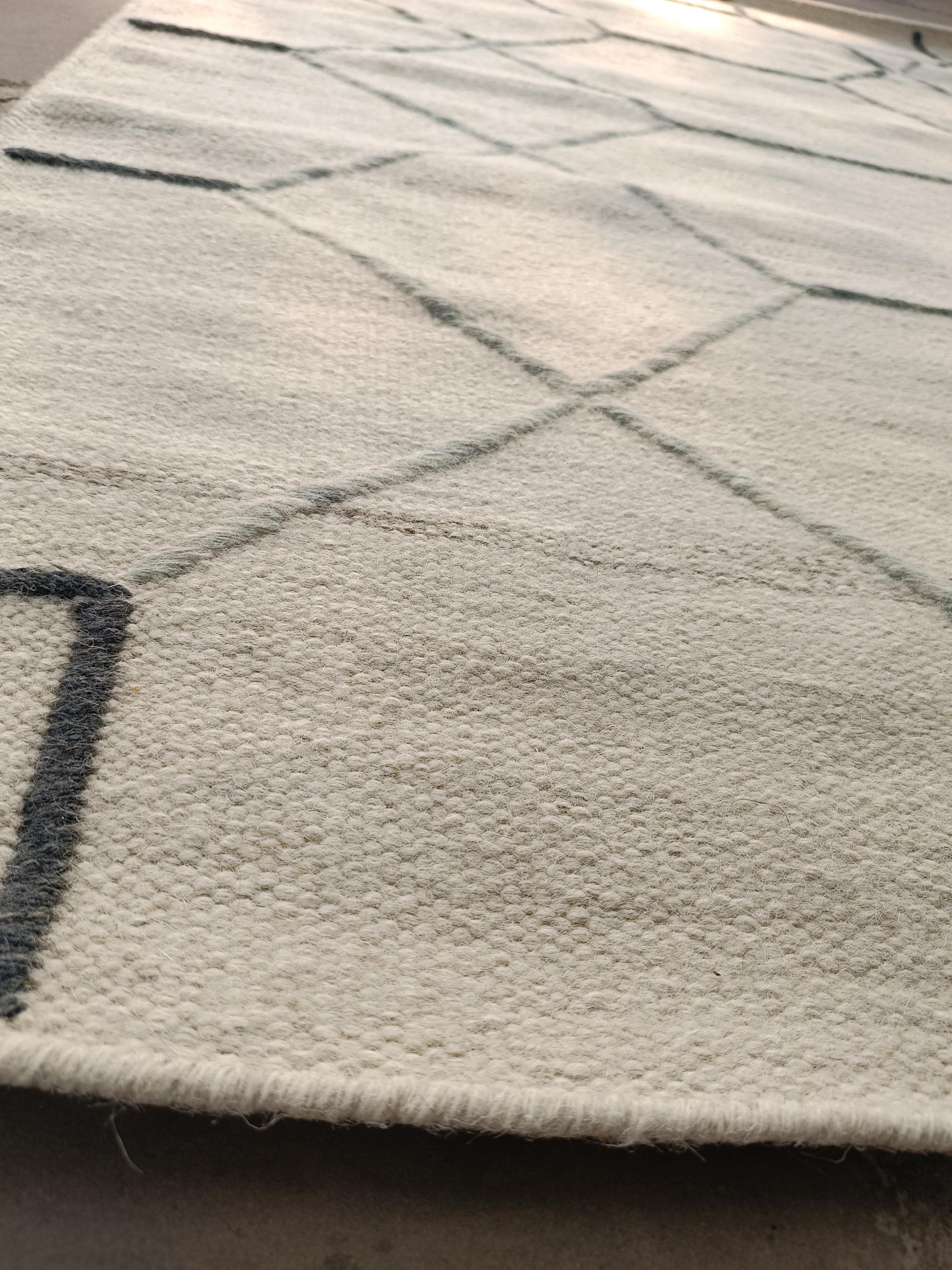 Its flatweave construction makes it lightweight, versatile, and easy to style—perfect for living rooms, bedrooms, studios, or layered in boho and Scandinavian interiors. The understated black and muted green lines add just enough contrast while keeping the look timeless and serene.