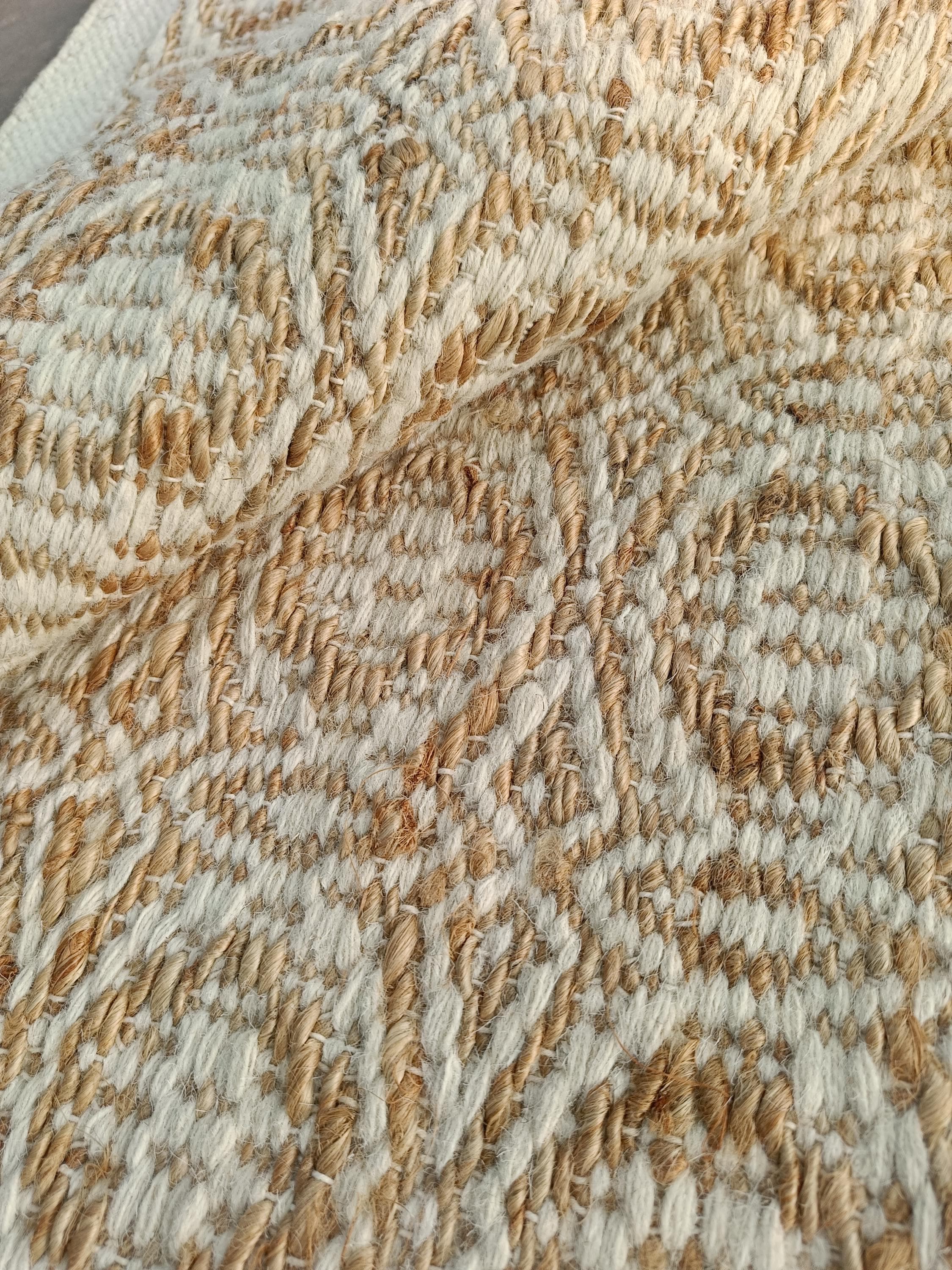 Add natural and subtle texture to your space with this handwoven jute rug, designed in soothing shades of beige and ivory. The repeating textured pattern creates visual depth while maintaining a clean, minimalist look that works beautifully in modern and boho interiors.