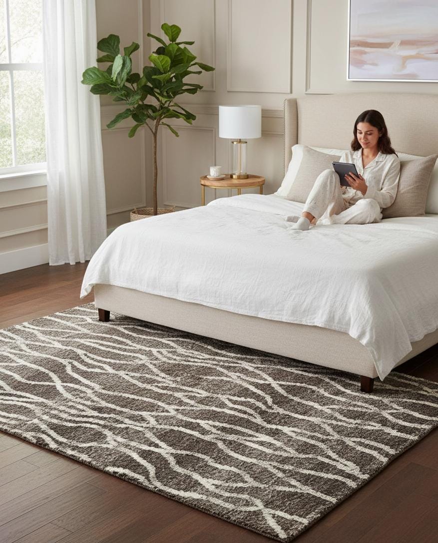 Handwoven Wool Rug – Dark Brown & Ivory Wave Pattern Area Rug, Modern Boho Textured Floor Mat