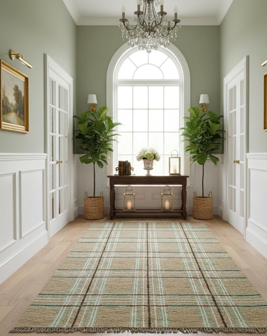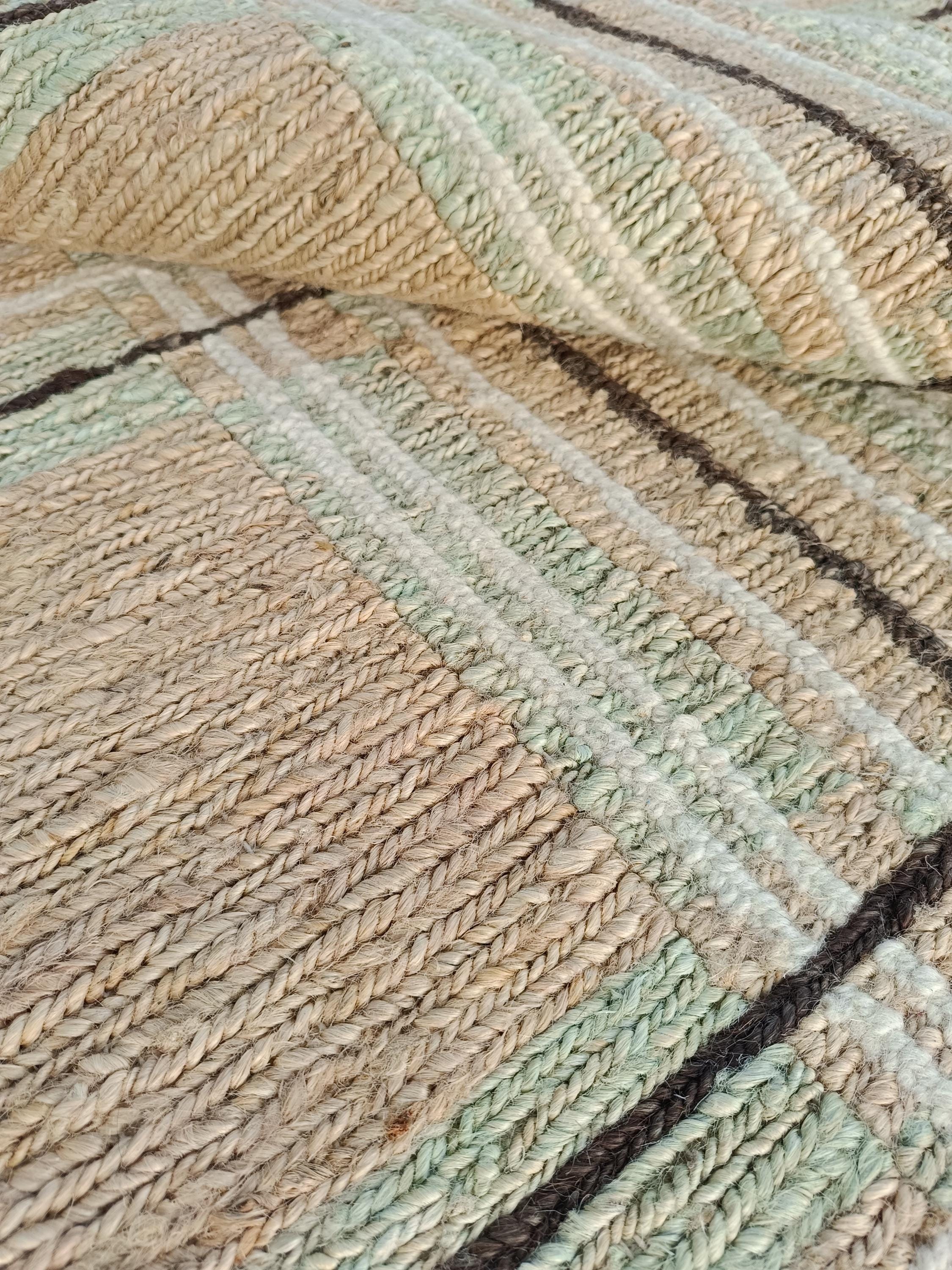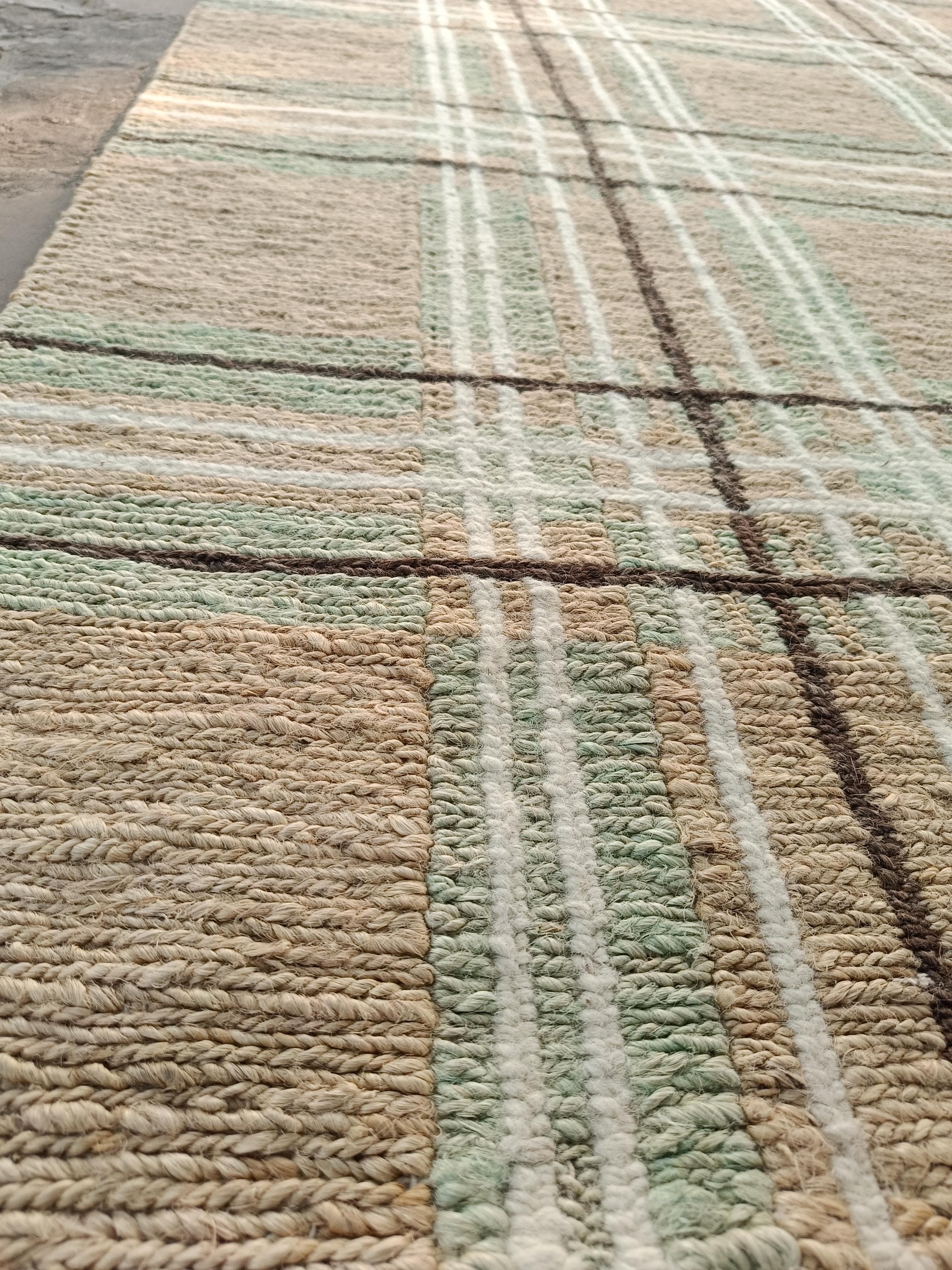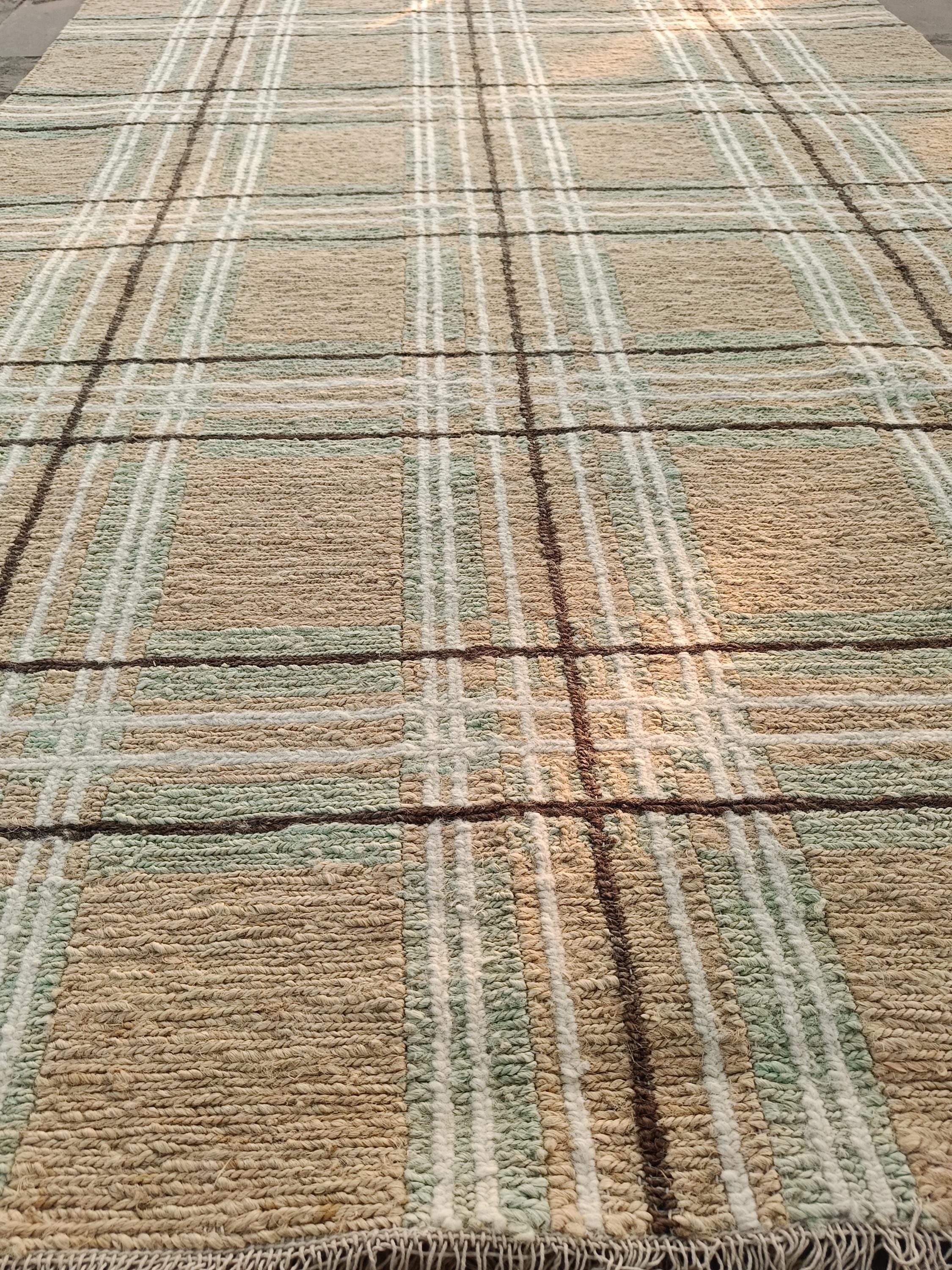 Handwoven Jute Plaid Rug – Neutral Checkered Area Rug with Green & Brown Stripes, Rustic Farmhouse Boho Floor rug
