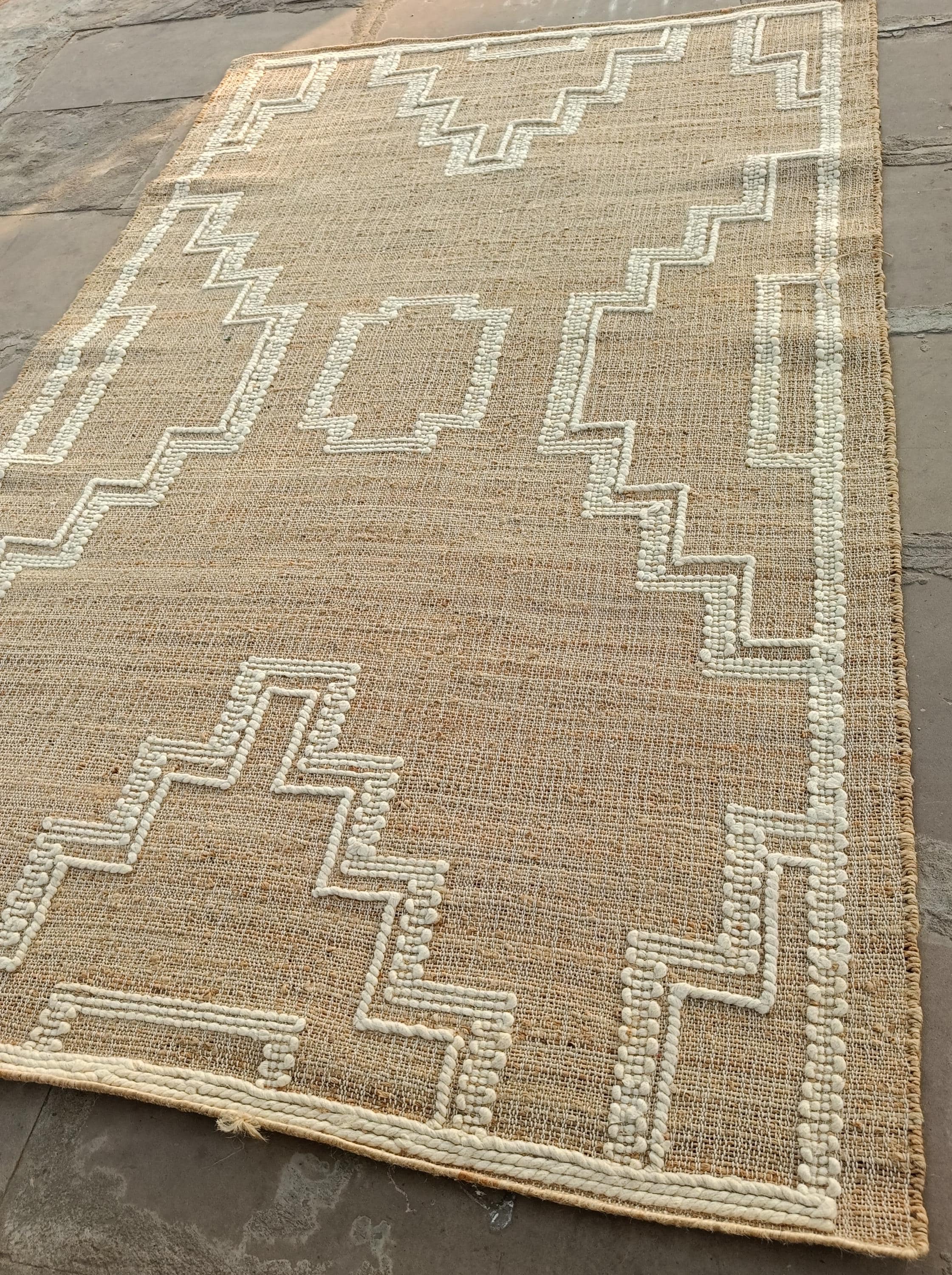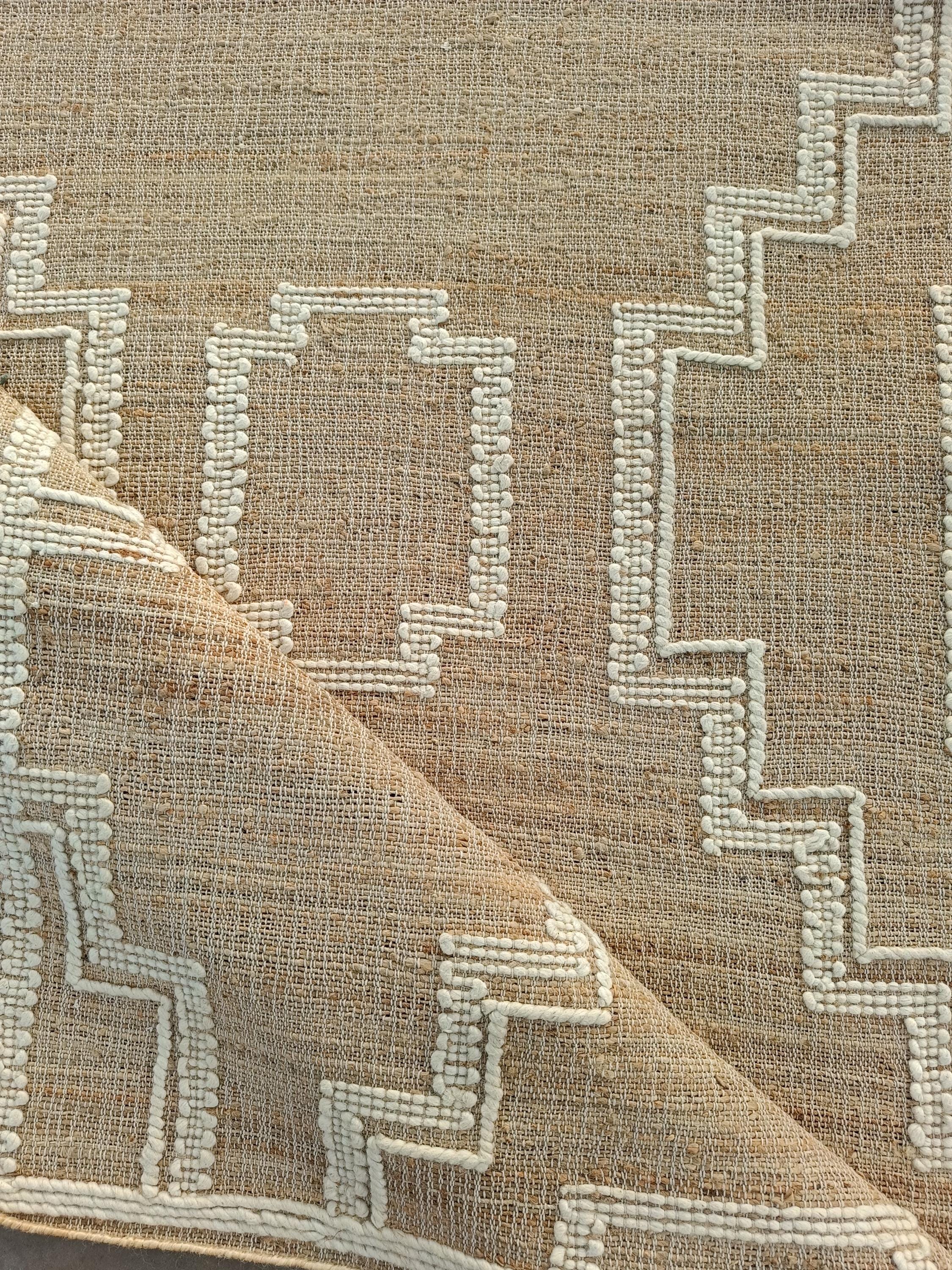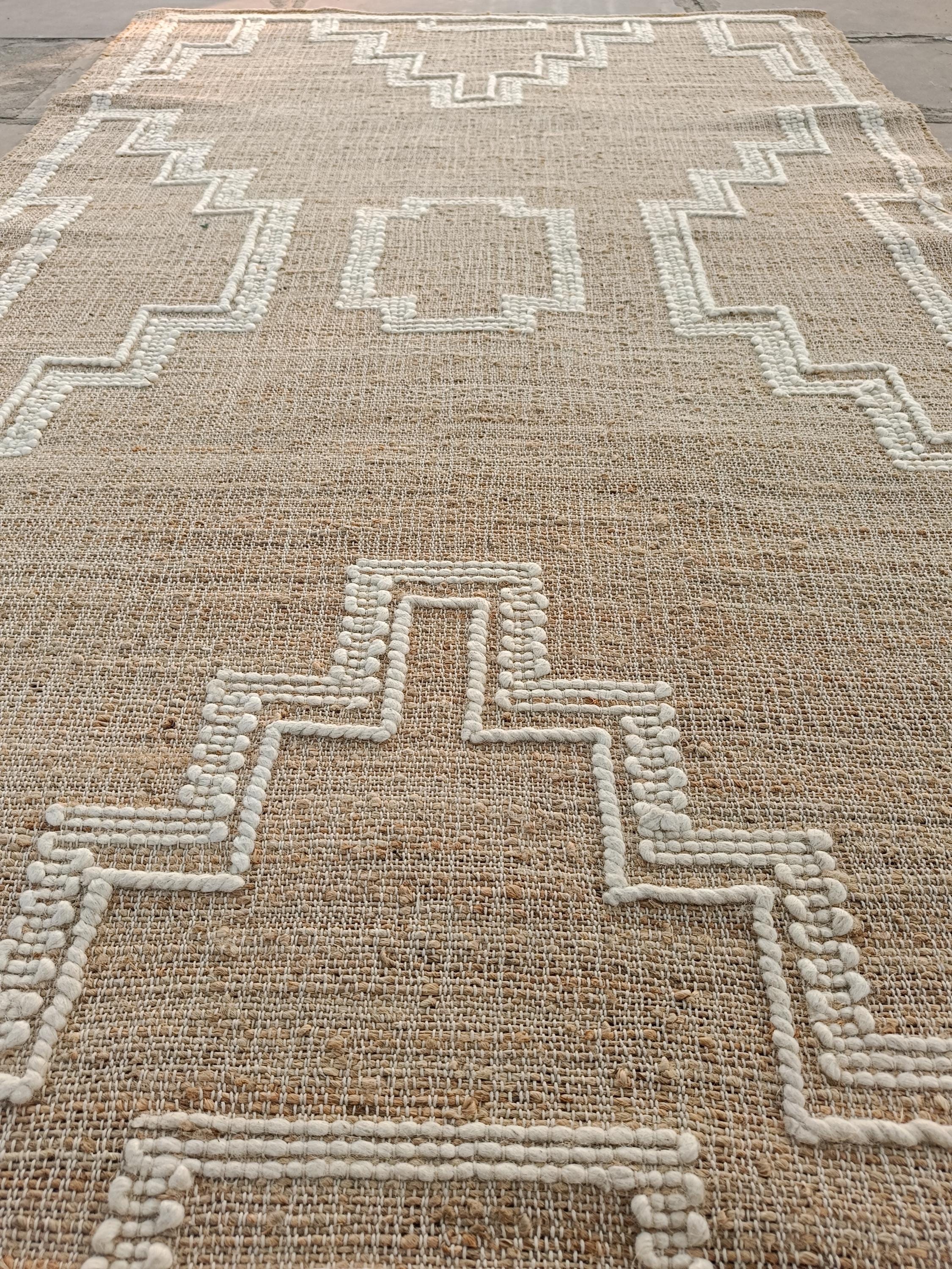 Bring warmth and texture to your space with this handwoven jute rug, beautifully accented with raised cotton embroidery in a bold geometric tribal pattern. Crafted using natural fibers, this rug blends rustic charm with timeless bohemian style, making it a versatile addition to both modern and traditional interiors.