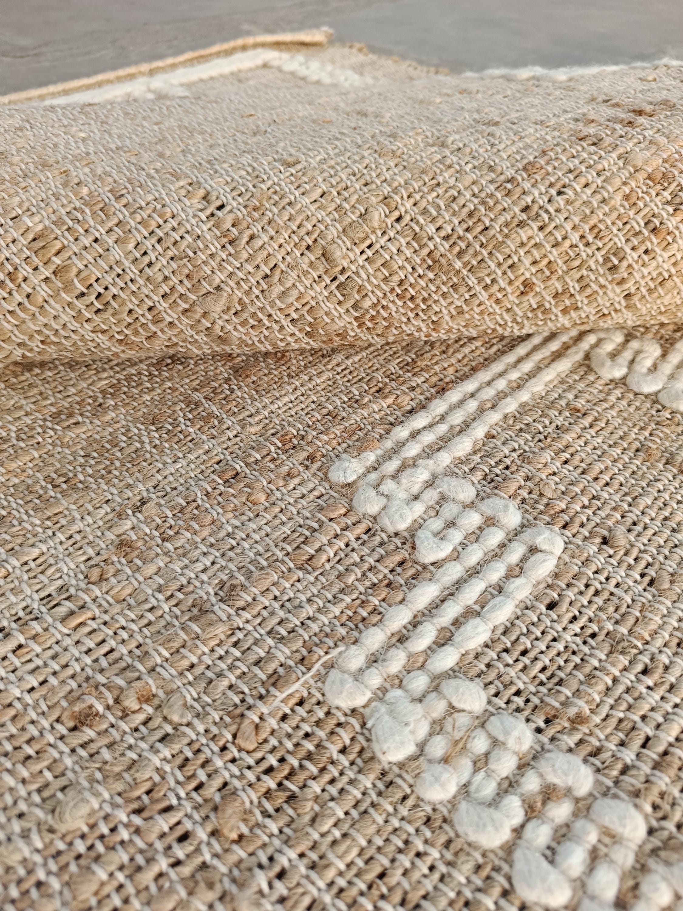 Handwoven Jute Rug with Cotton Embroidery – Rustic Boho Floor Mat, Natural Fiber Home Decor