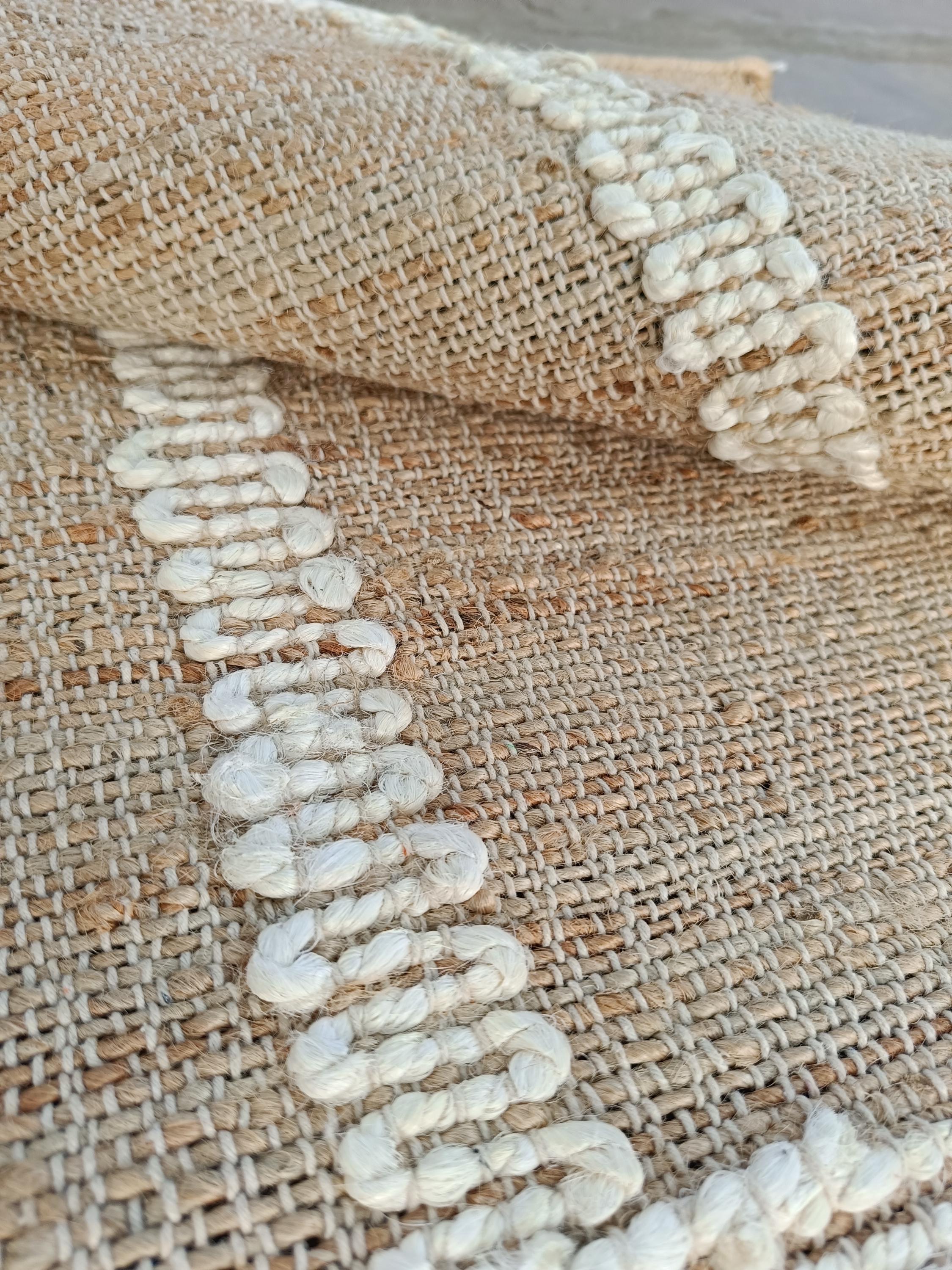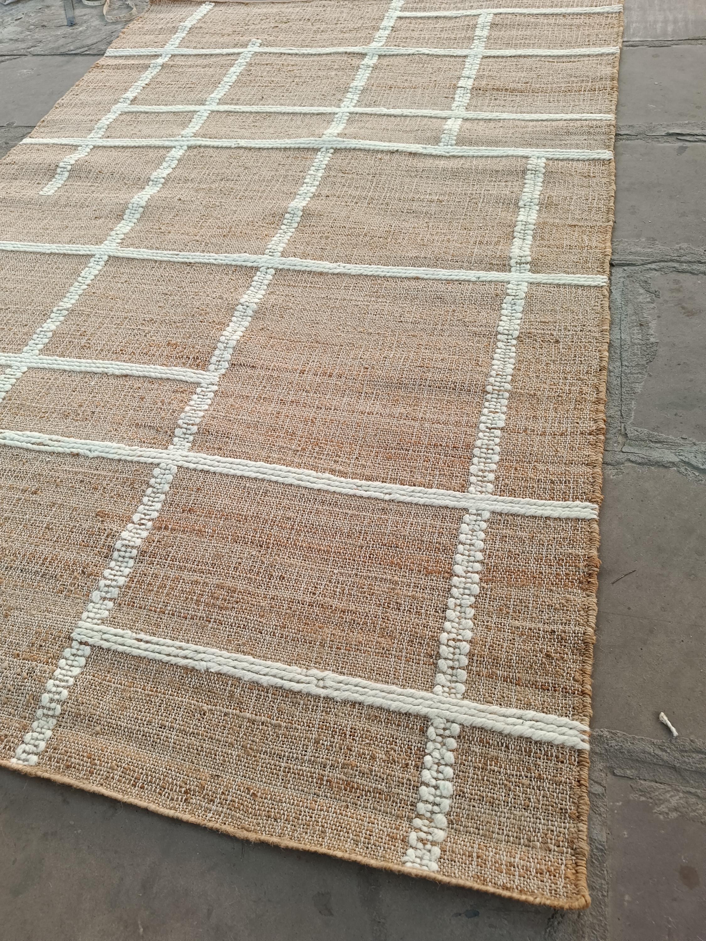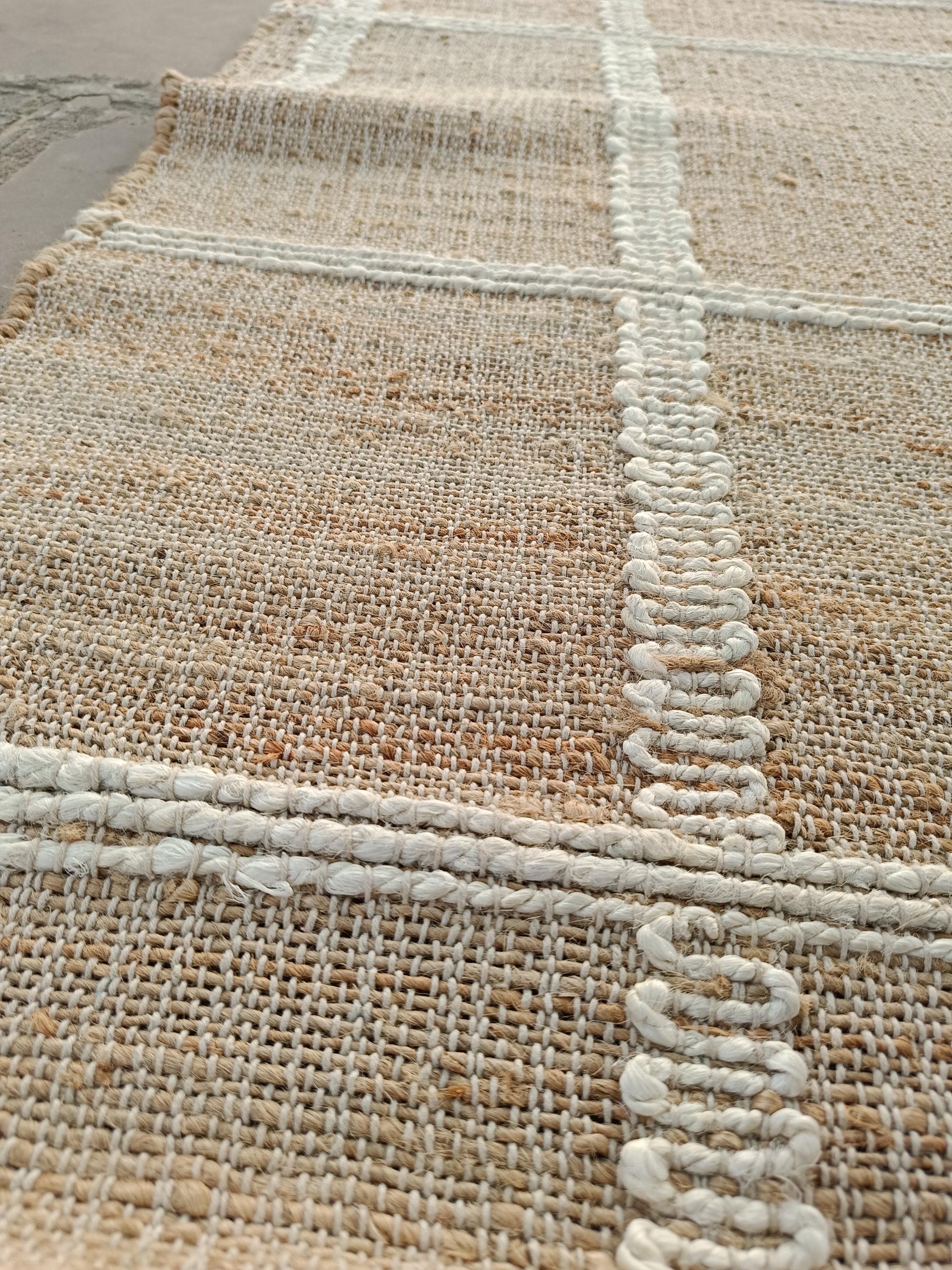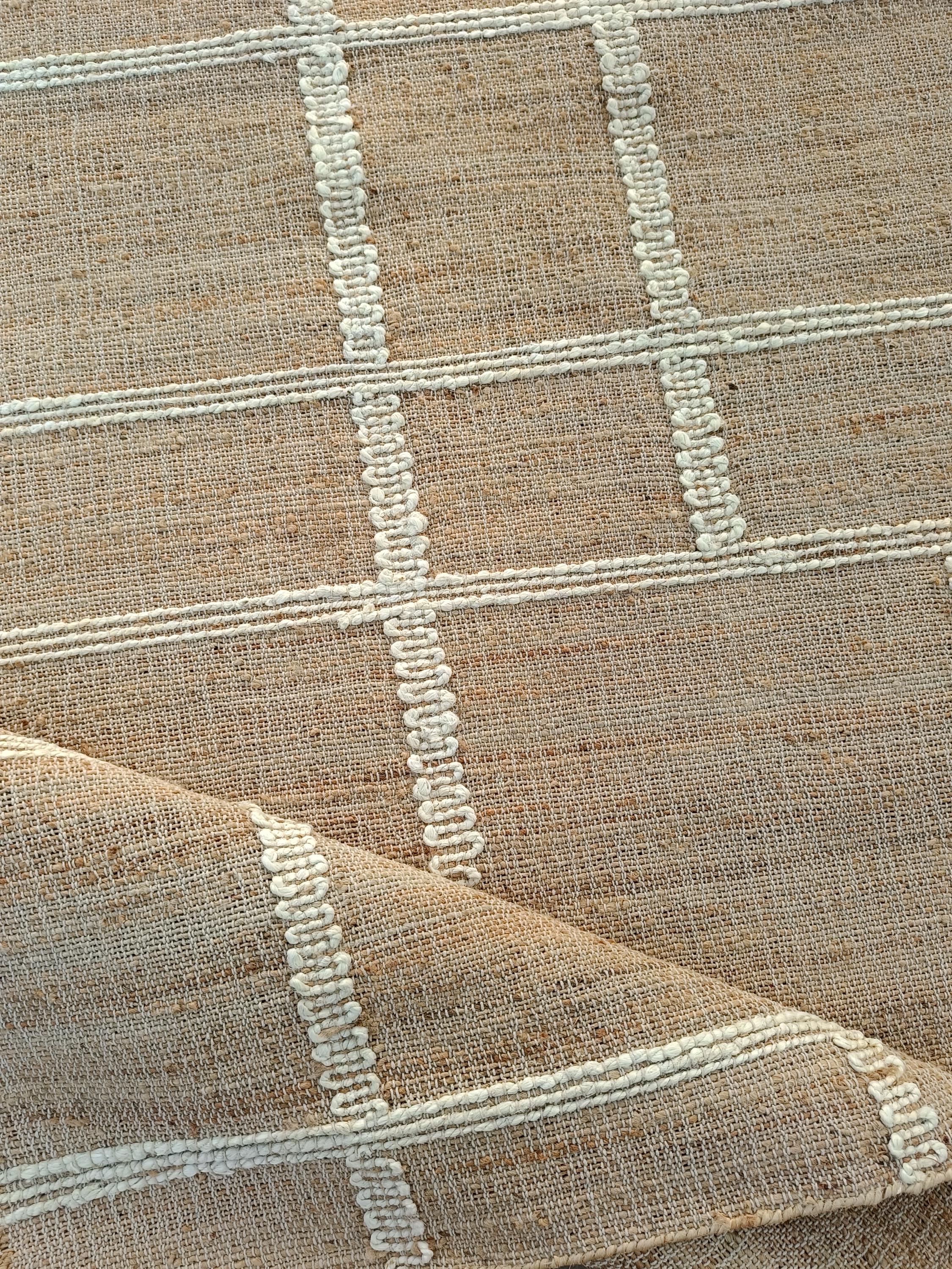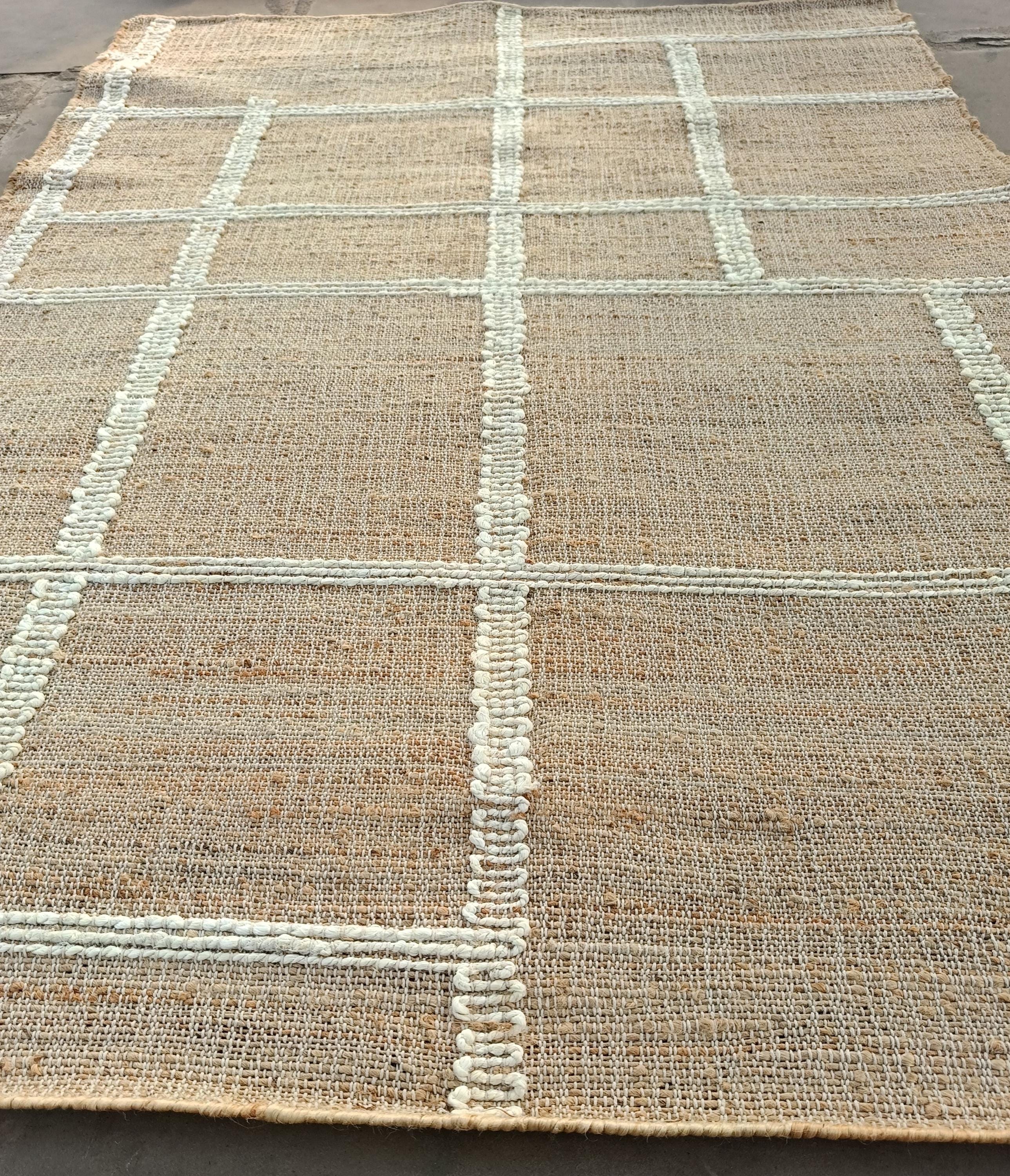 Add warmth and natural texture to your home with this beautifully handwoven jute dhurrie rug. Crafted from 100% natural jute fibers, this flatweave rug features a subtle beige base with raised geometric line detailing that gives it a modern yet rustic appeal.