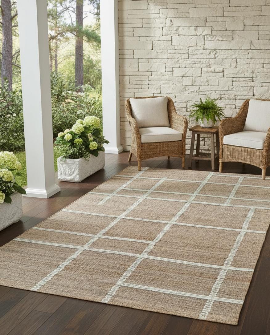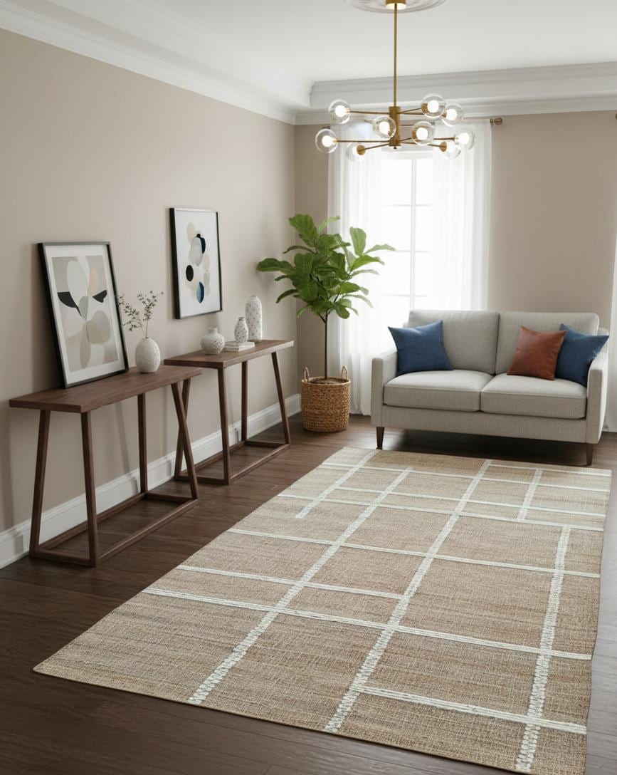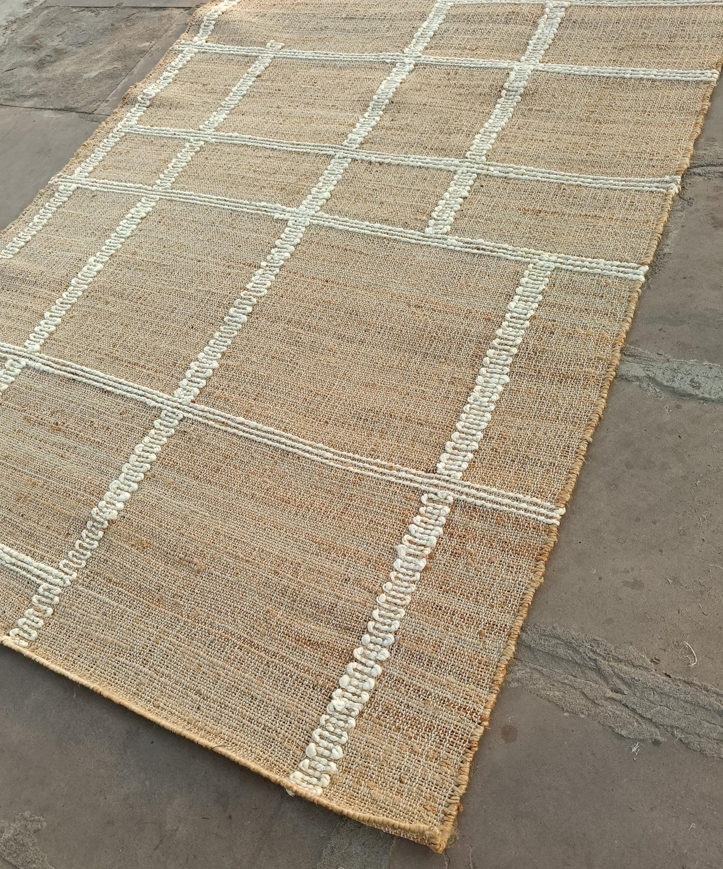 Handwoven Jute Dhurrie Rug – Natural Beige Flatweave – Rustic Farmhouse Area Rug – Eco Friendly Boho Floor Mat – Geometric Line Pattern Rug